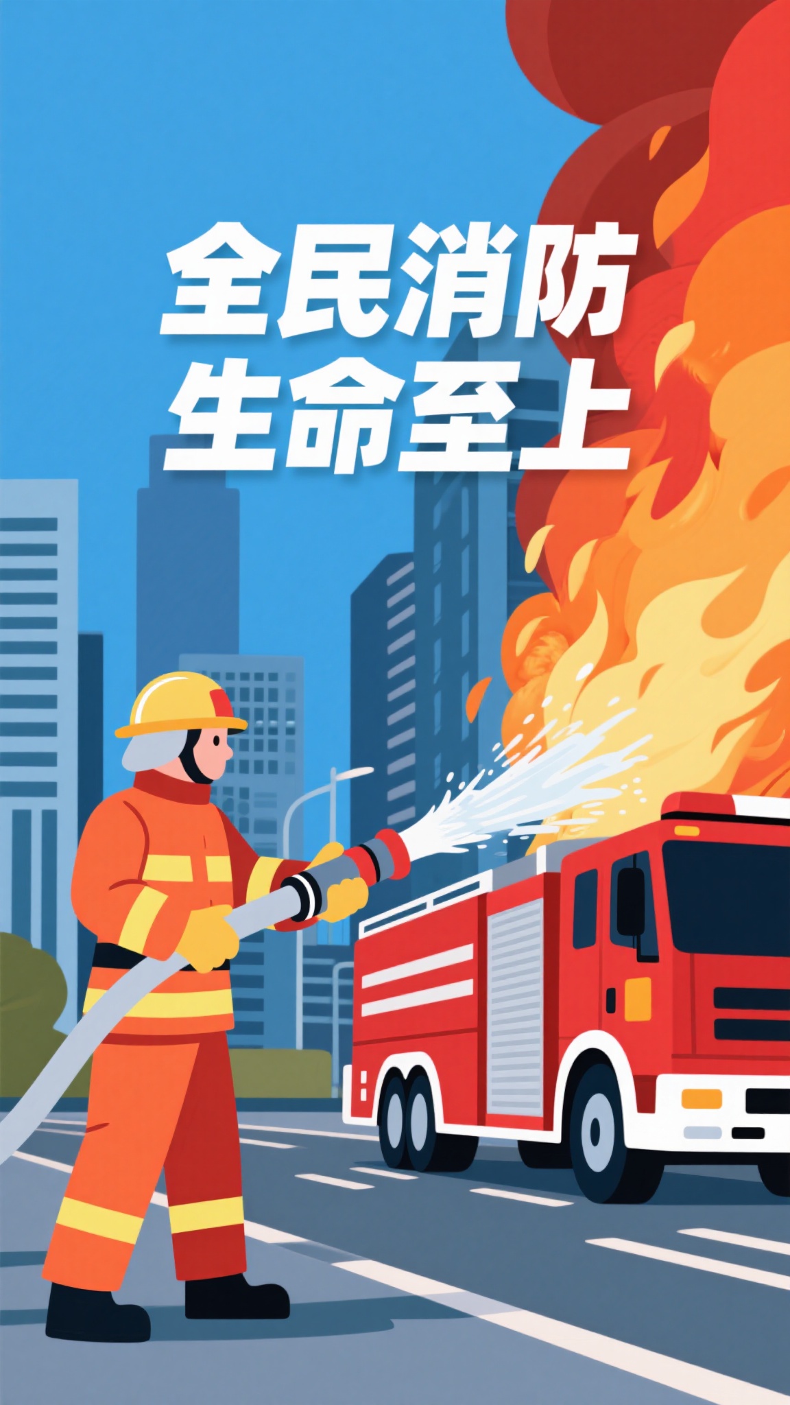 作品描述:写实扁平风格,消防员操作水枪强力灭火,红色消防车与现代城市背景呼应,搭配 “全民消防 生命至上” bold 白字,风格现代专业,突出消防救援的行动力。