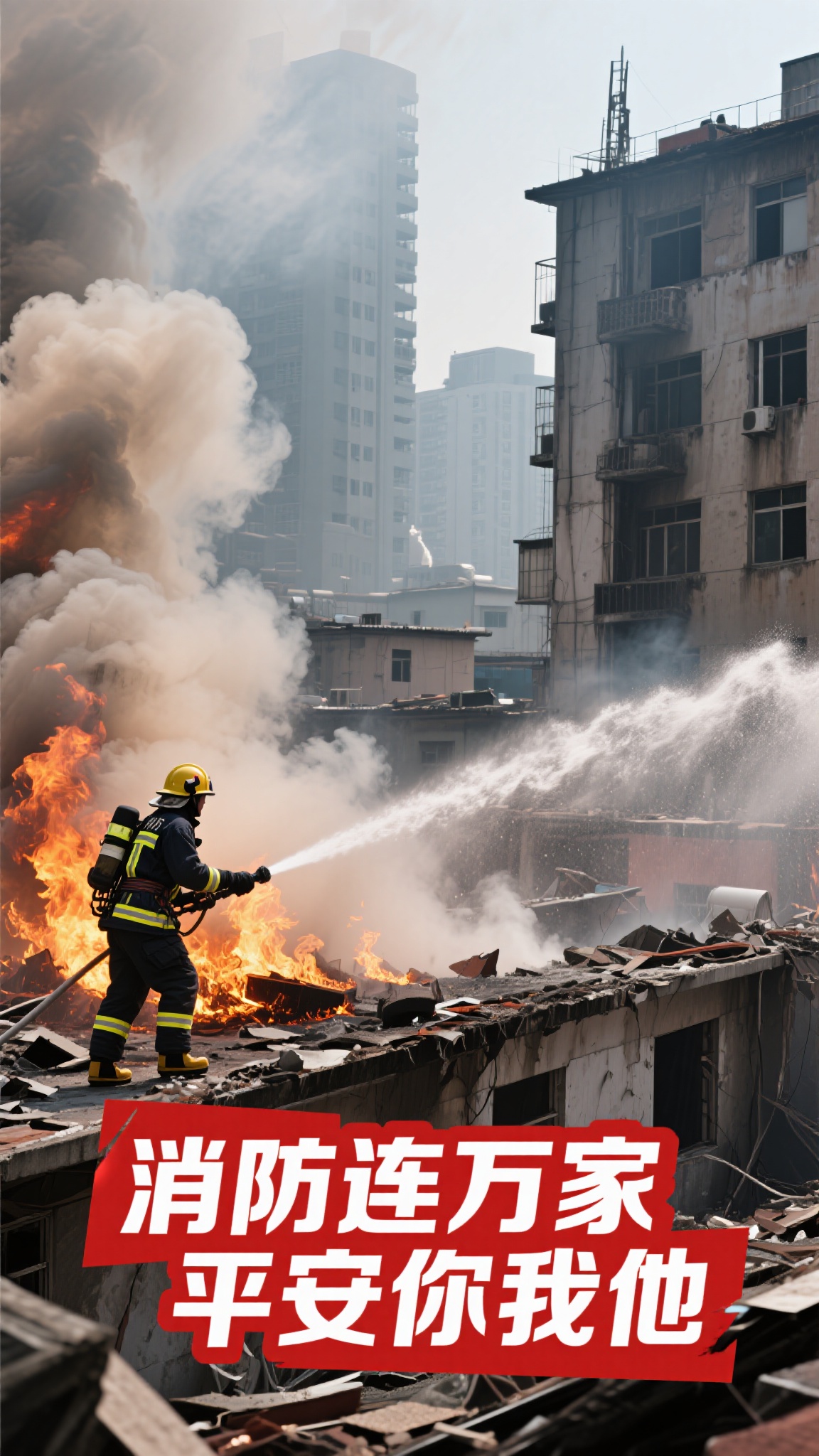 作品描述:纪实风格,消防员在城市屋顶全力喷水灭火,真实火灾场景(浓烟、火焰、建筑废墟)极具临场感,搭配 “消防连万家 平安你我他” 红色标语,突出救援的真实性与民生关联。