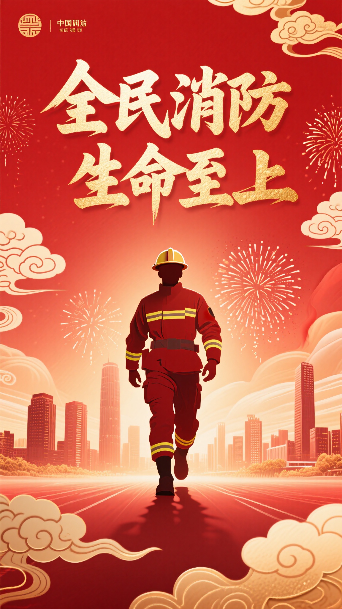 作品描述:国风红金风格,消防员剪影与城市烟火相融,红金渐变背景点缀传统云纹,搭配 “全民消防 生命至上” 大气红金大字,将现代消防与传统美学结合,庄重且富有文化感。