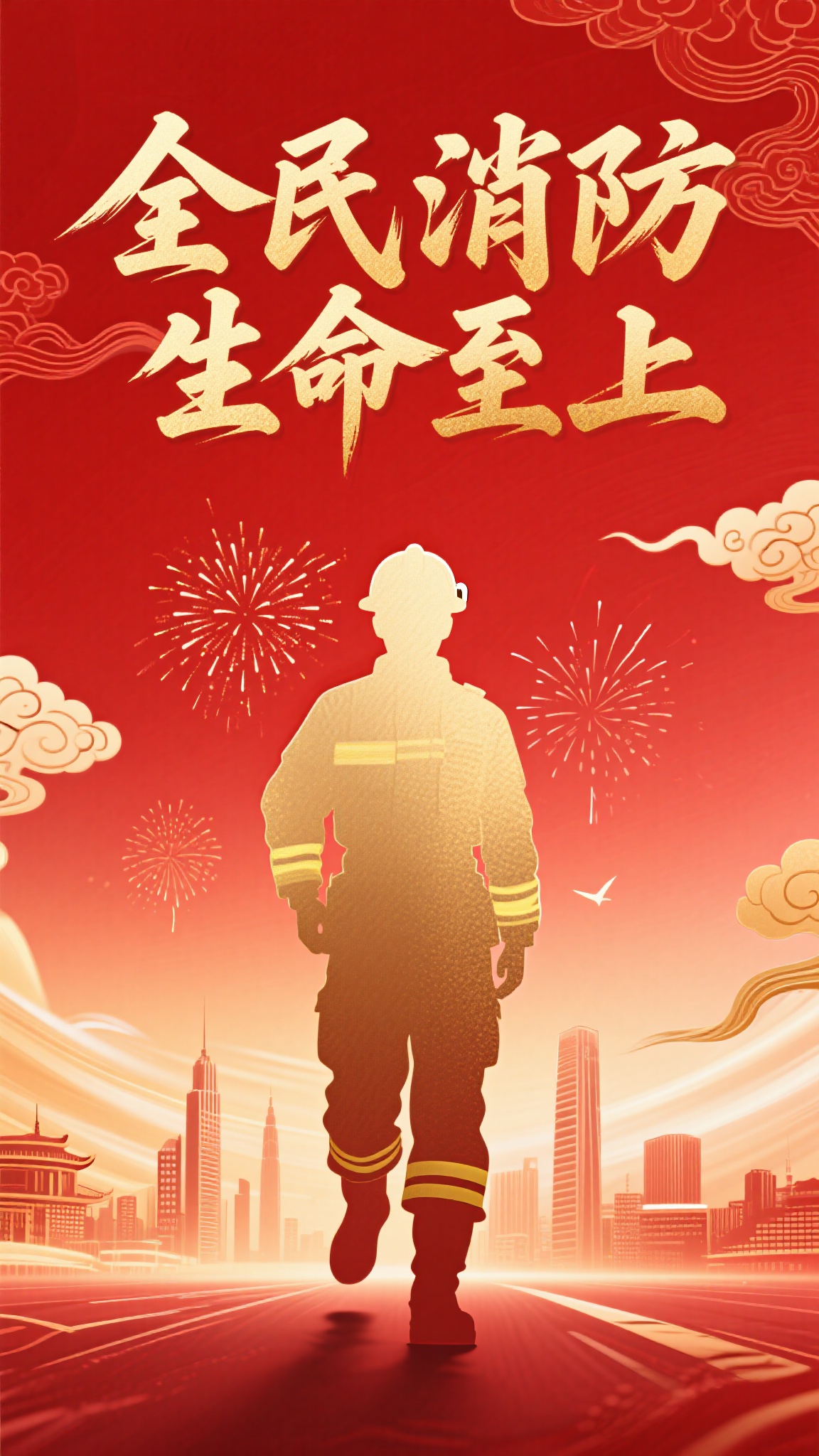 作品描述:国风红金风格,消防员剪影与城市烟火相融,红金渐变背景点缀传统云纹,搭配 “全民消防 生命至上” 大气红金大字,将现代消防与传统美学结合,庄重且富有文化感。