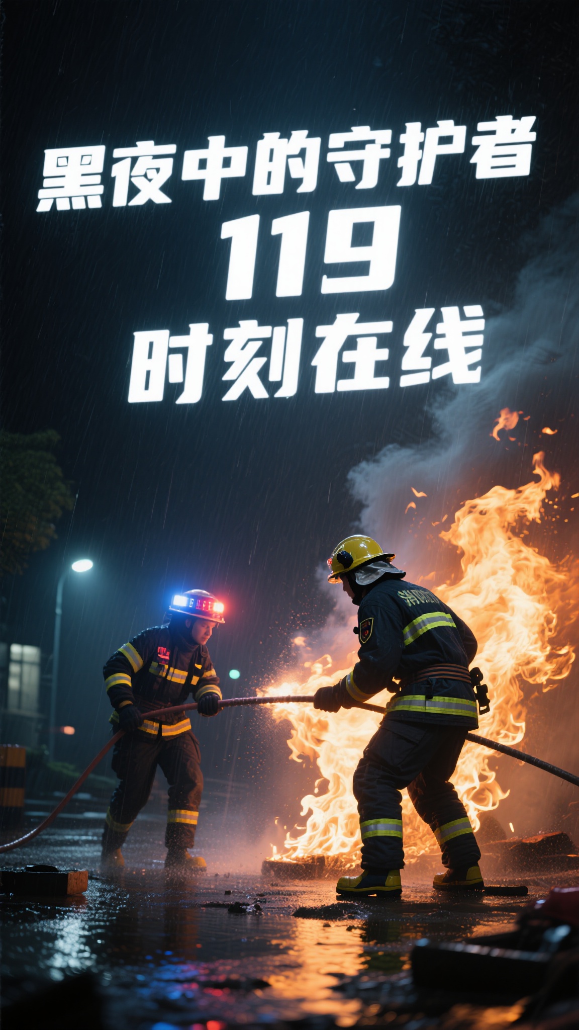 作品描述:夜间救援风格,消防员夜间冒雨灭火,警灯闪烁划破黑夜,火焰与雨夜形成强烈对比,搭配 “黑夜中的守护者 119 时刻在线” 白色发光字,凸显消防救援的全天候守护。