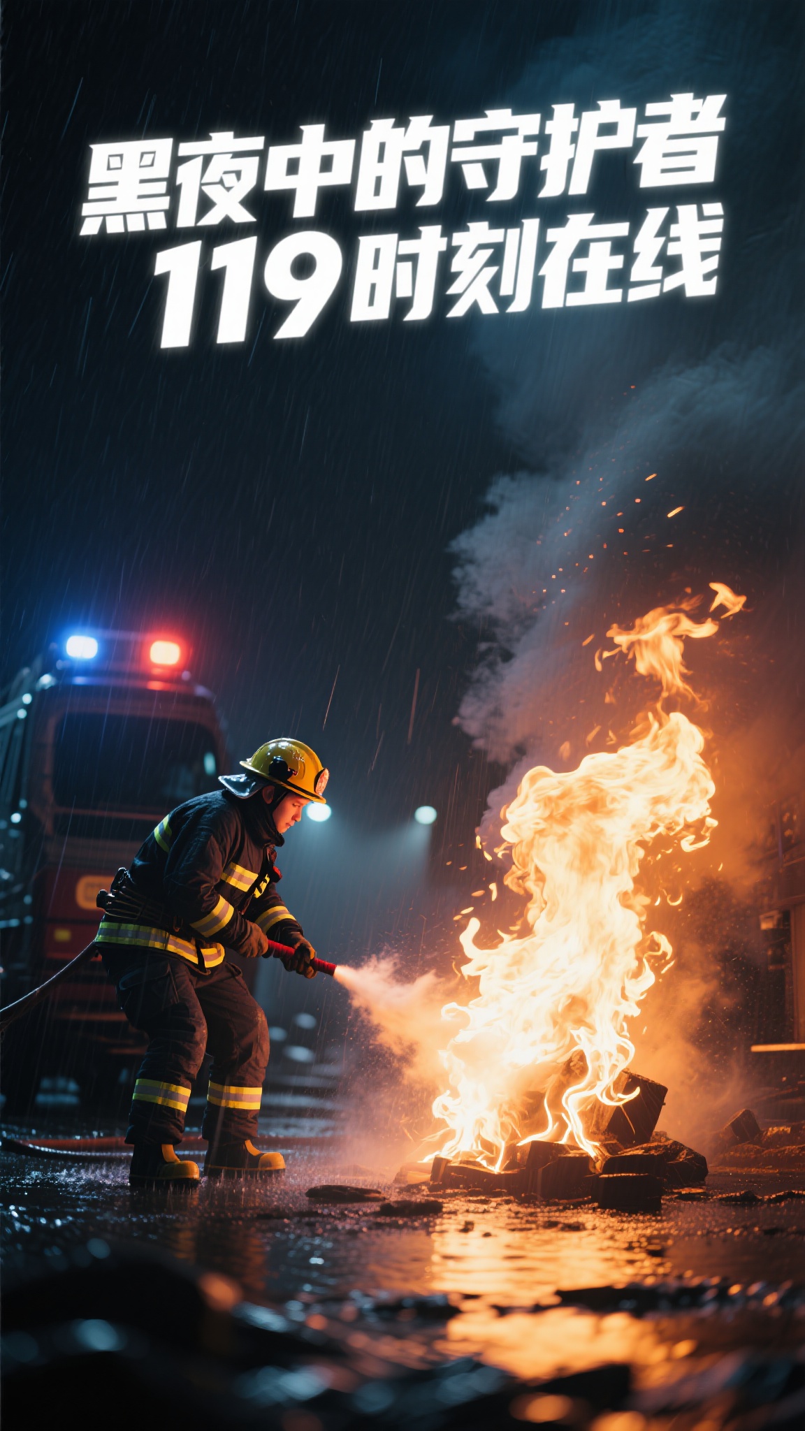 作品描述:夜间救援风格,消防员夜间冒雨灭火,警灯闪烁划破黑夜,火焰与雨夜形成强烈对比,搭配 “黑夜中的守护者 119 时刻在线” 白色发光字,凸显消防救援的全天候守护。