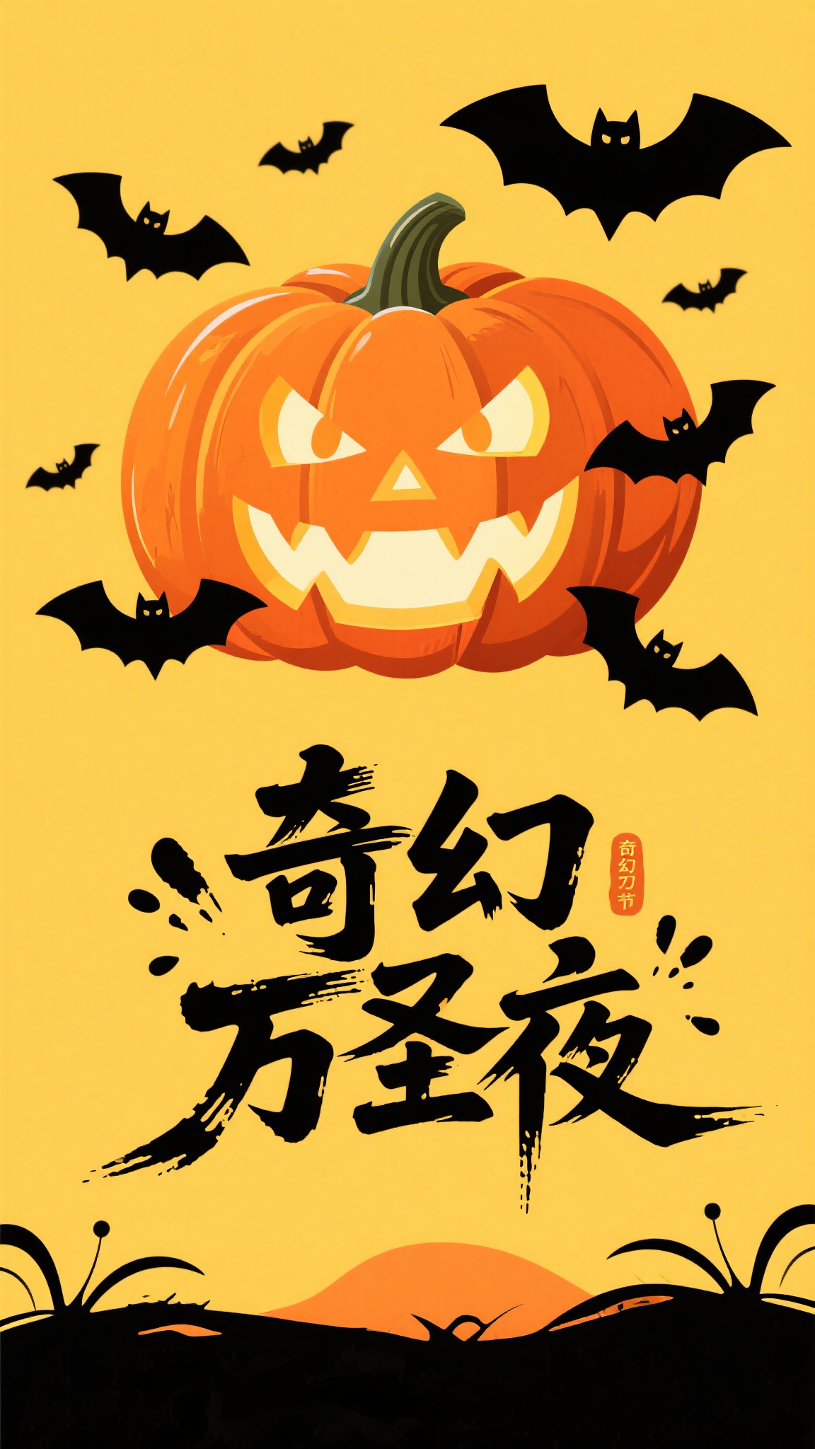 作品描述:夸张扁平风格,黄橙背景,巨型南瓜灯(表情狰狞),蝙蝠环绕飞舞,下方 “奇幻万圣夜” 泼墨艺术字,整体视觉冲击力强,突出南瓜元素的节日感。