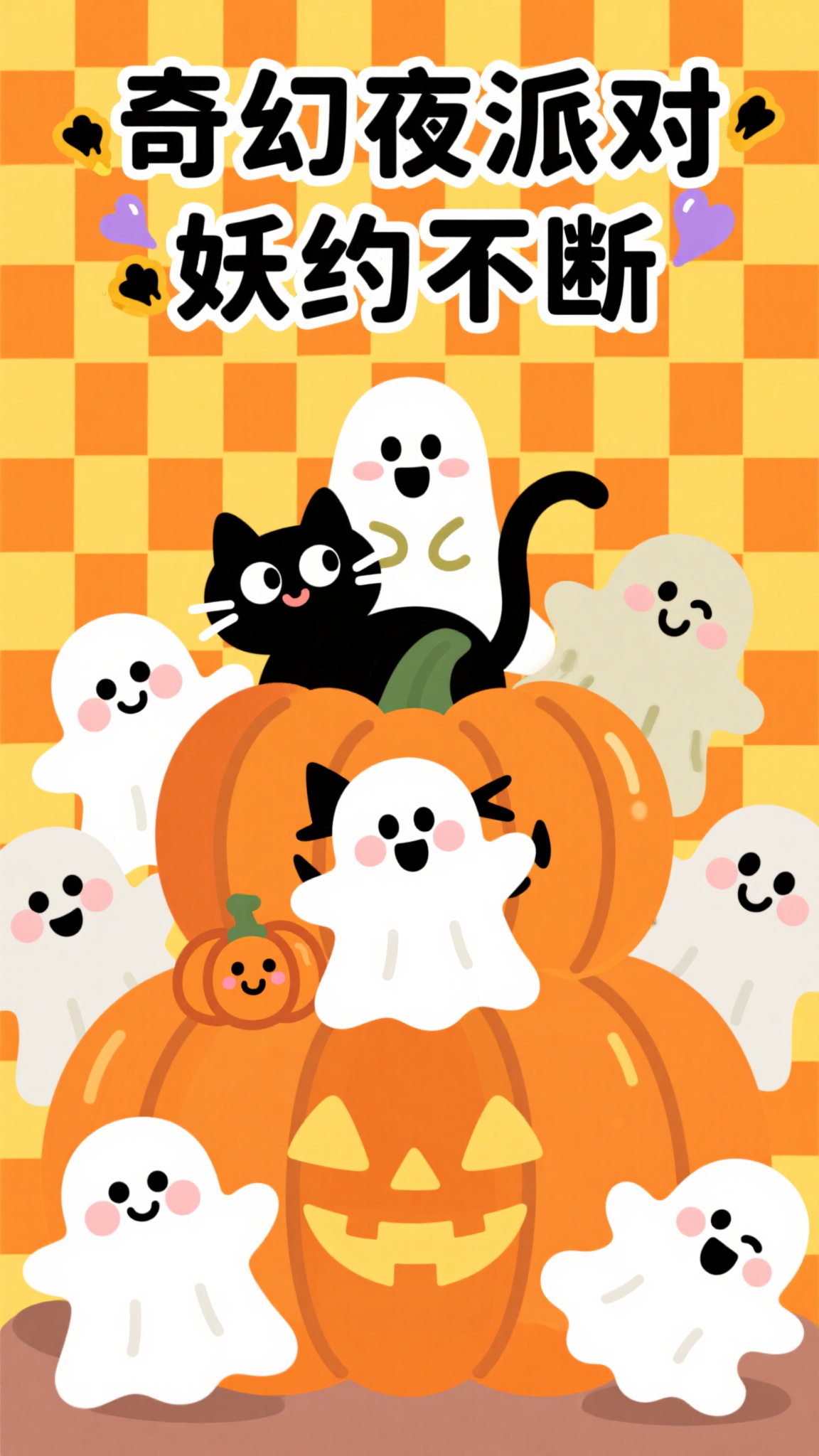 作品描述:萌系卡通风格,黄橙格子背景,多只幽灵(表情各异)堆叠在南瓜堆上,黑猫与小南瓜穿插其中,上方 “奇幻夜派对 妖约不断” 可爱艺术字,充满童趣互动感。