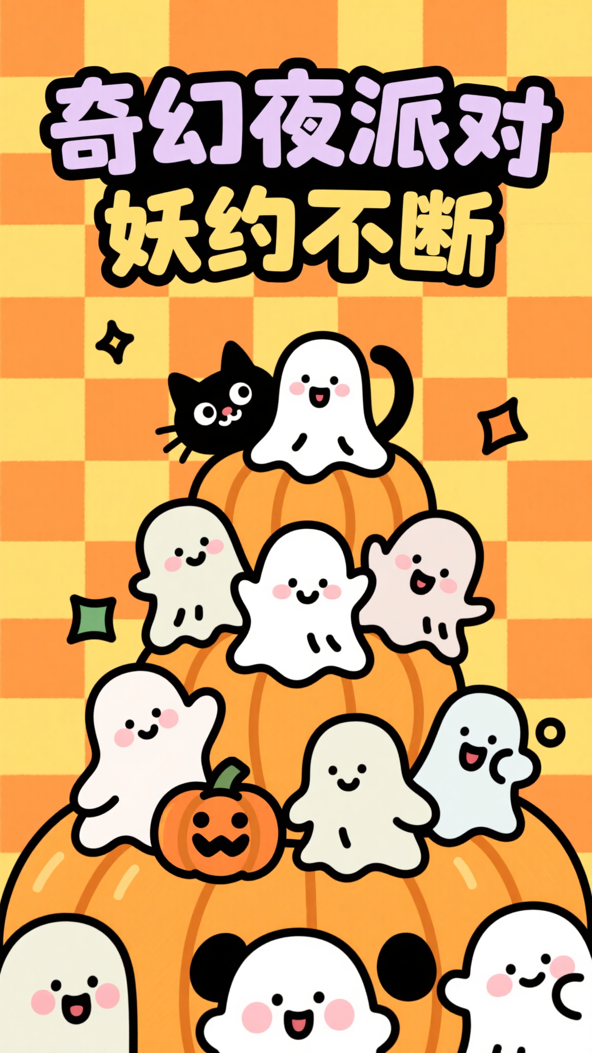 作品描述:萌系卡通风格,黄橙格子背景,多只幽灵(表情各异)堆叠在南瓜堆上,黑猫与小南瓜穿插其中,上方 “奇幻夜派对 妖约不断” 可爱艺术字,充满童趣互动感。