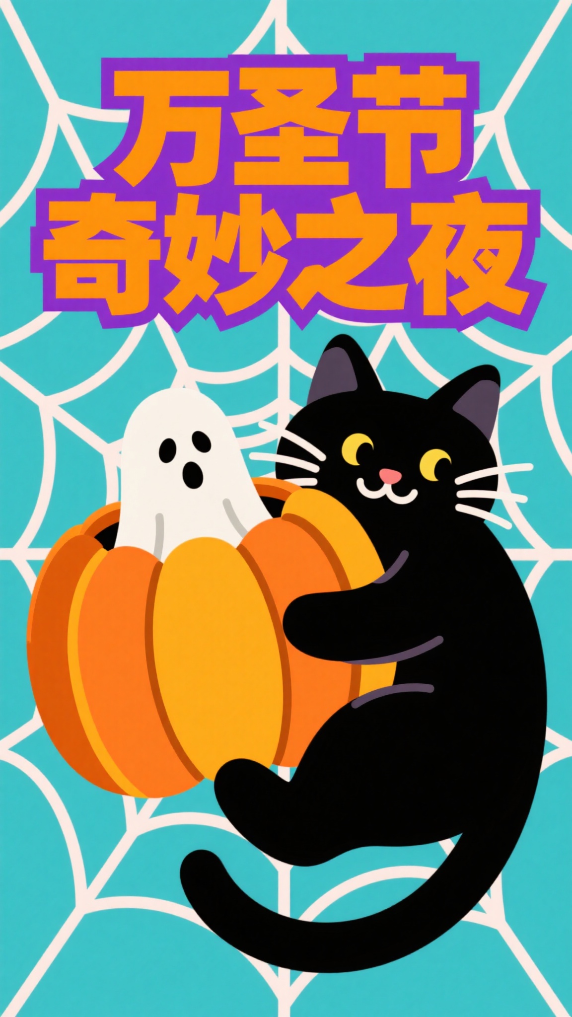 作品描述:撞色扁平风格,紫橙配色,黑猫怀抱南瓜(幽灵从南瓜中探出),背景带蜘蛛网纹理,上方 “万圣节 奇妙之夜” bold 艺术字,突出黑猫与南瓜的趣味互动。