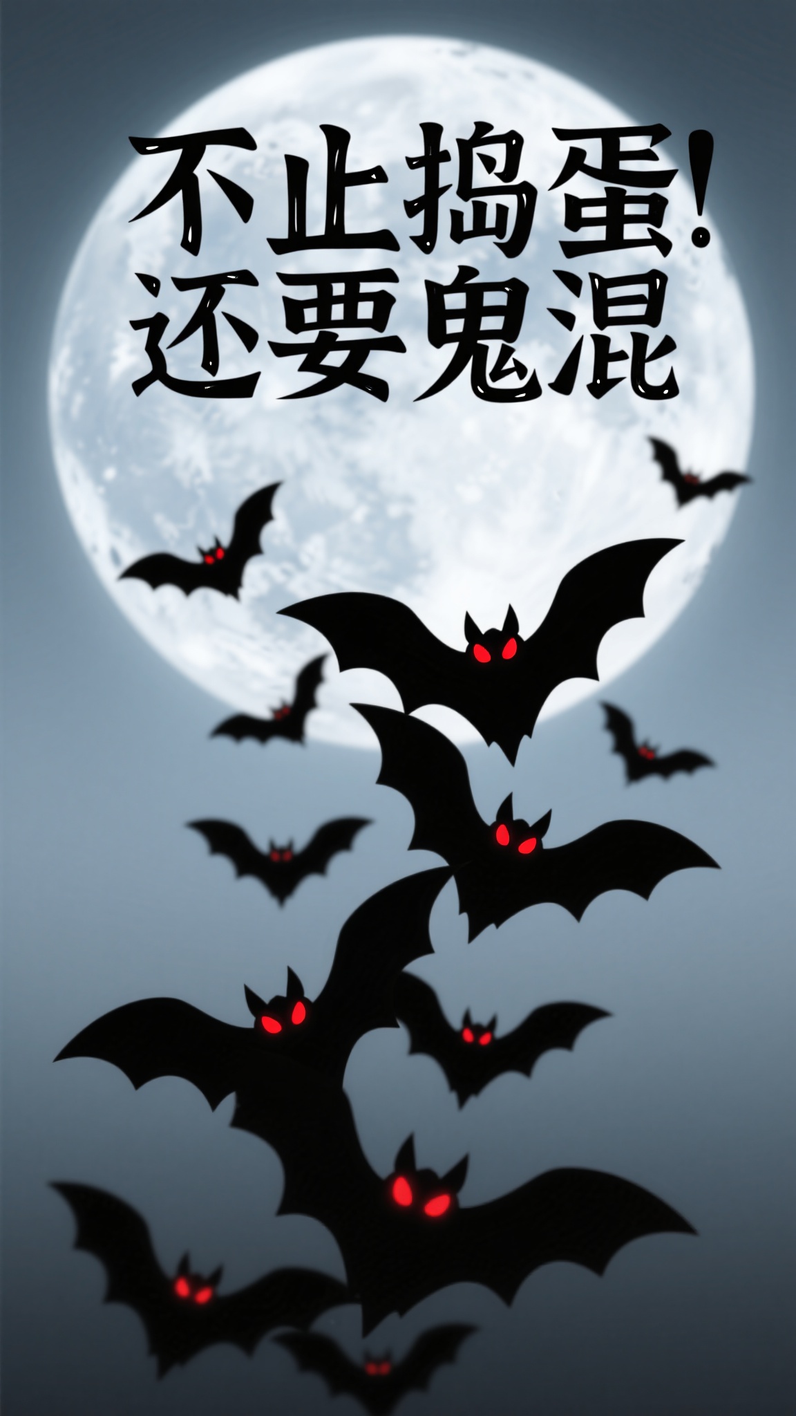 作品描述:冷调暗黑风格,灰蓝渐变背景,满月高悬,多只蝙蝠(眼睛发红光)层叠飞舞,上方 “不止捣蛋 还要鬼混” 简约艺术字,氛围神秘冷峻,凸显万圣节的暗黑感。