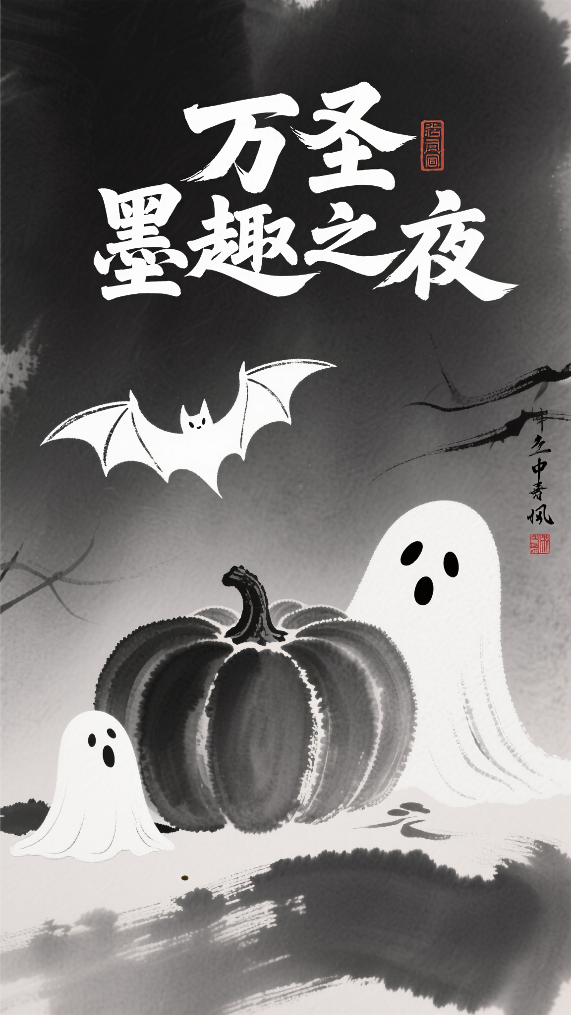 作品描述:水墨国风风格,黑白灰背景,南瓜与幽灵以水墨晕染呈现,蝙蝠以飞白笔触绘制,上方 “万圣 墨趣之夜” 书法字,整体雅致且具节日意境,水墨元素凸显传统韵味。