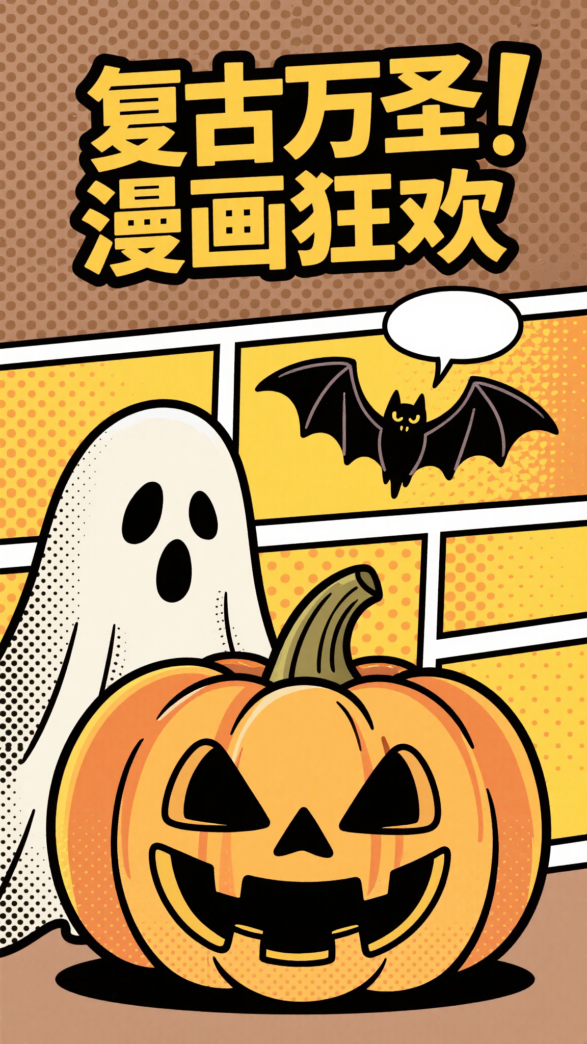 作品描述:复古漫画风格,棕黄网点背景,南瓜幽灵以复古漫画笔触绘制(带网点纹理),蝙蝠为漫画拟声词风格,上方 “复古万圣 漫画狂欢” 艺术字,充满漫画分镜的叙事感。