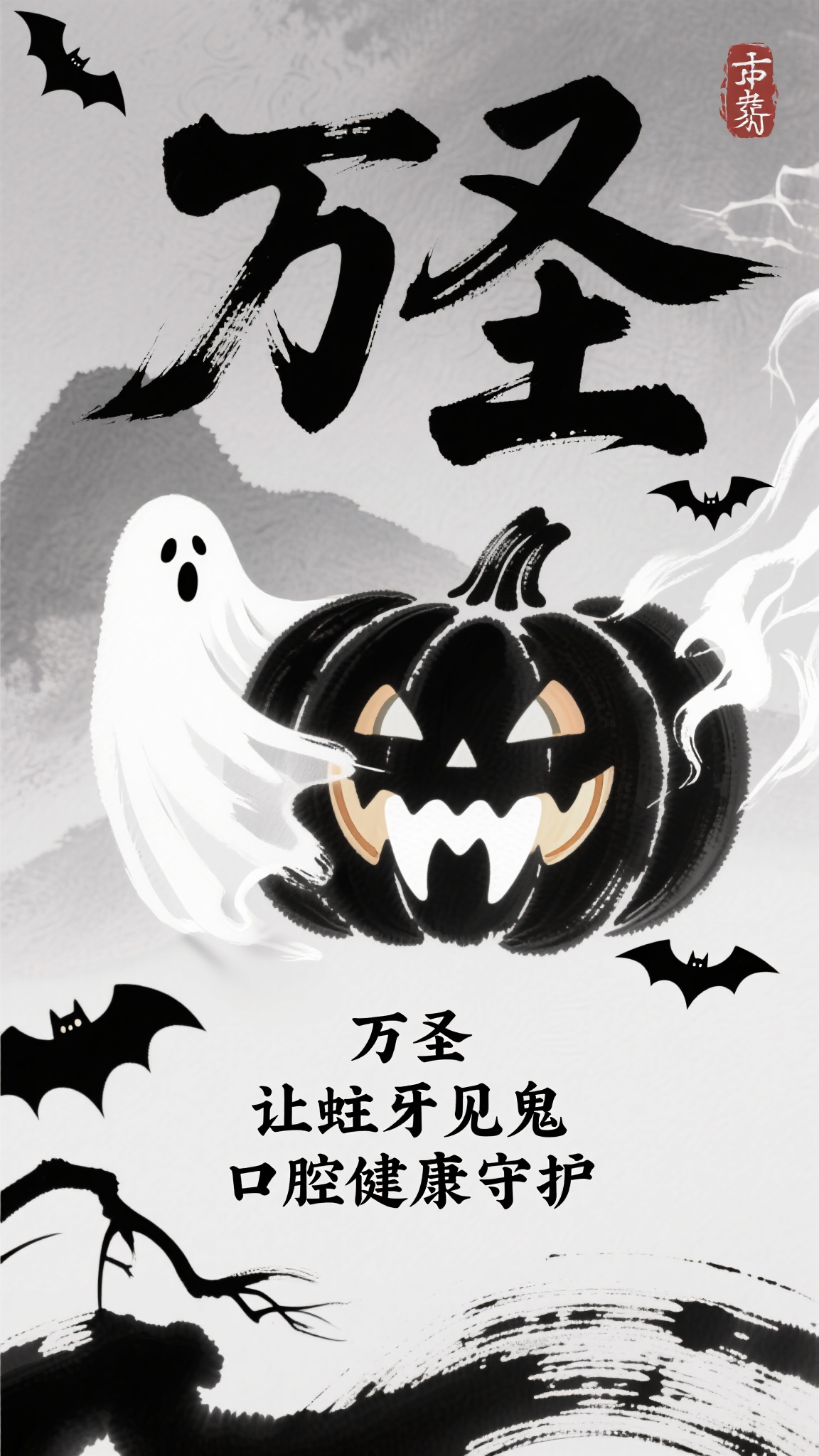 作品描述:国风水墨风格,黑白灰水墨背景,南瓜灯、牙齿以水墨晕染呈现,幽灵、蝙蝠用飞白笔触,配文 “万圣 让蛀牙见鬼 口腔健康守护”,传统水墨融合口腔医疗。