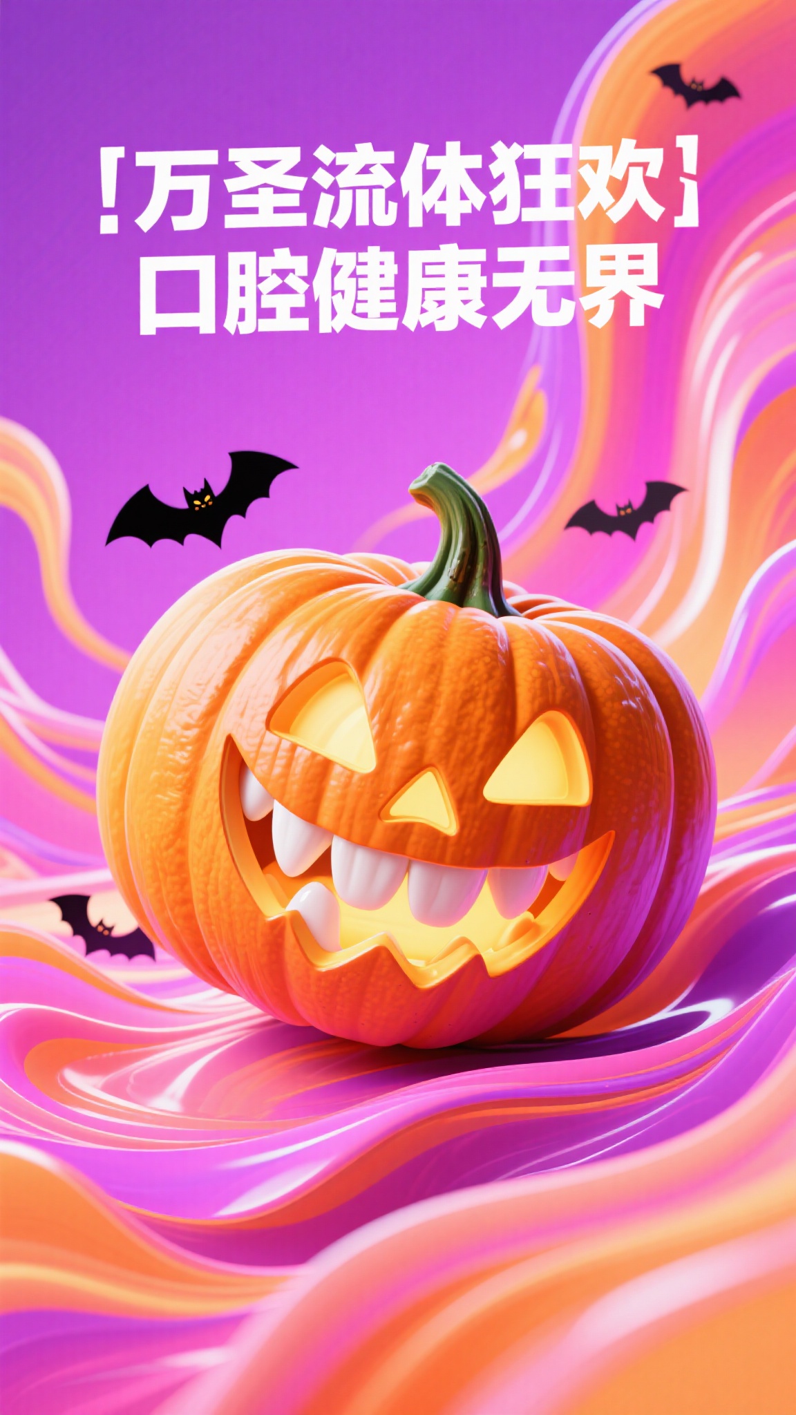 作品描述:流体艺术风格,粉紫橙渐变背景,南瓜灯与牙齿呈流体渐变,蝙蝠点缀,配文 “万圣流体狂欢 口腔健康无界”,流动色彩极具视觉冲击。