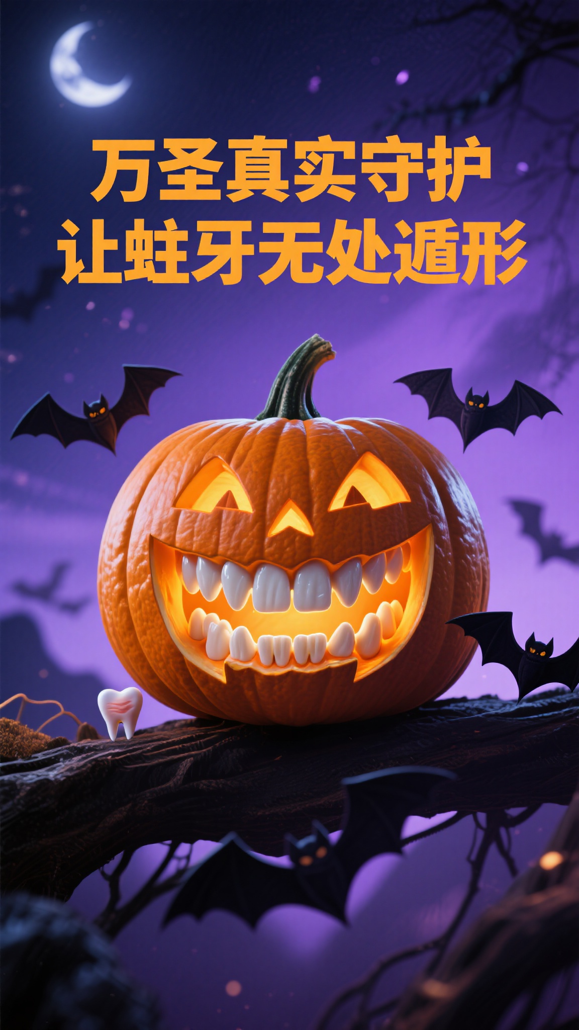 作品描述:写实风格,暗紫月夜背景,南瓜灯内嵌真实牙齿模型,蝙蝠环绕,配文 “万圣真实守护 让蛀牙无处遁形”,写实质感增强可信度。