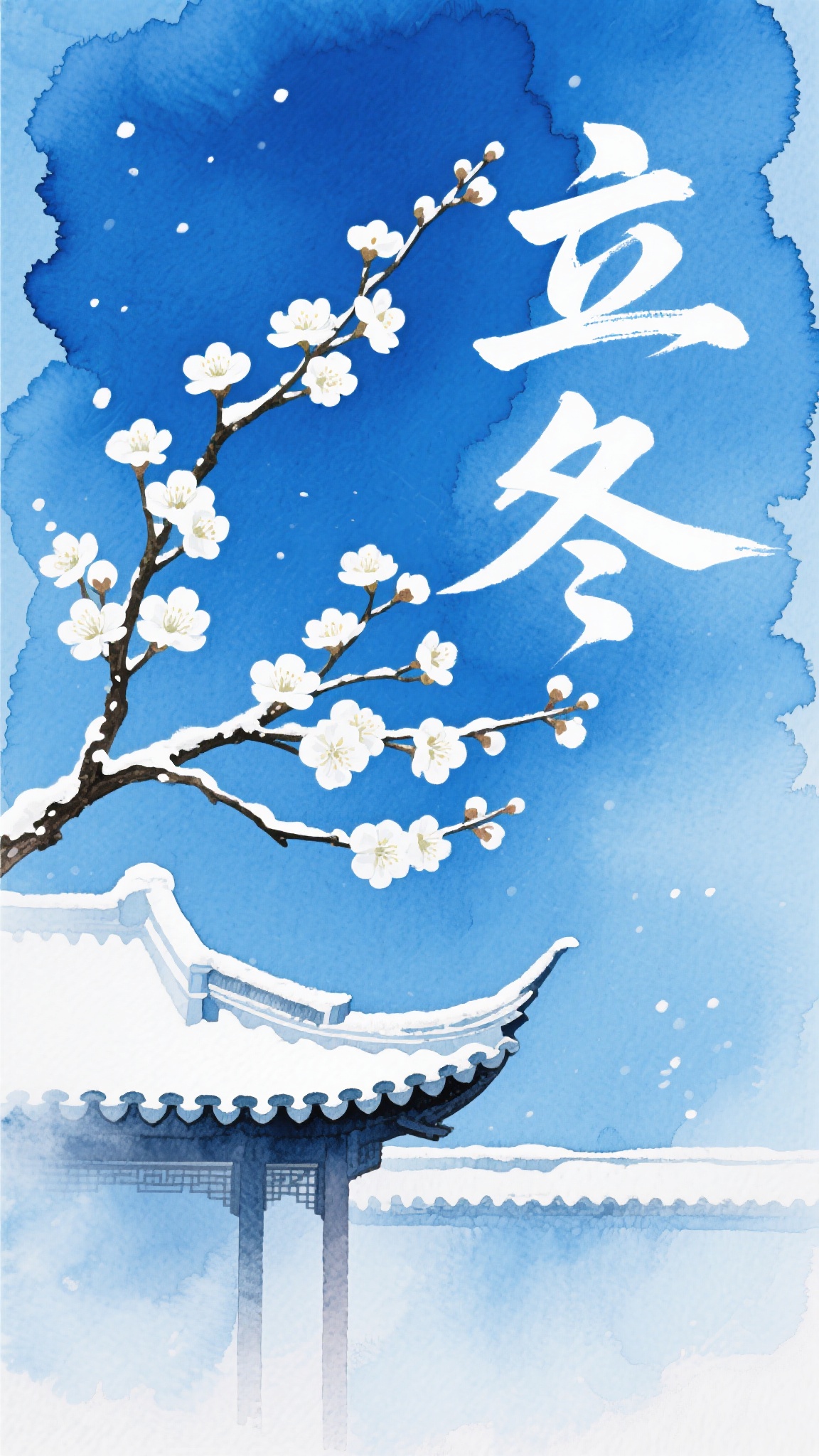 作品描述:水彩晕染风格,立冬主题,青蓝背景如寒天,白梅枝桠(花瓣带雪)斜出,“立冬” 白色飘逸书法,下方淡描中式建筑檐角,水彩通透,营造清冷冬意。