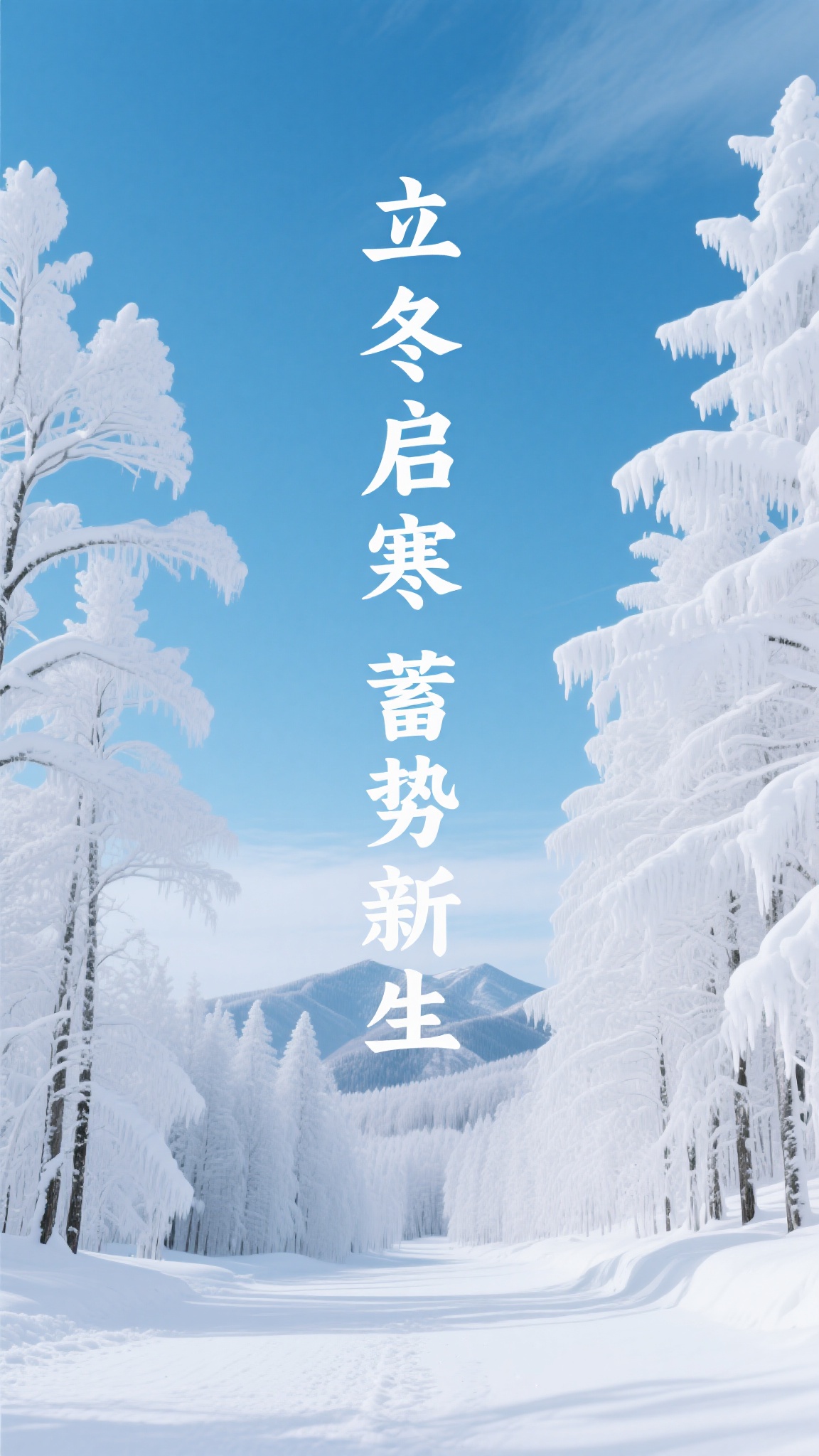 作品描述:纯白雪景风格,立冬林海雪原,雪覆树木挂冰,远山隐于蓝天,“立冬启寒 蓄势新生” 竖排白字,画面纯净,传递冬日静谧力量。
