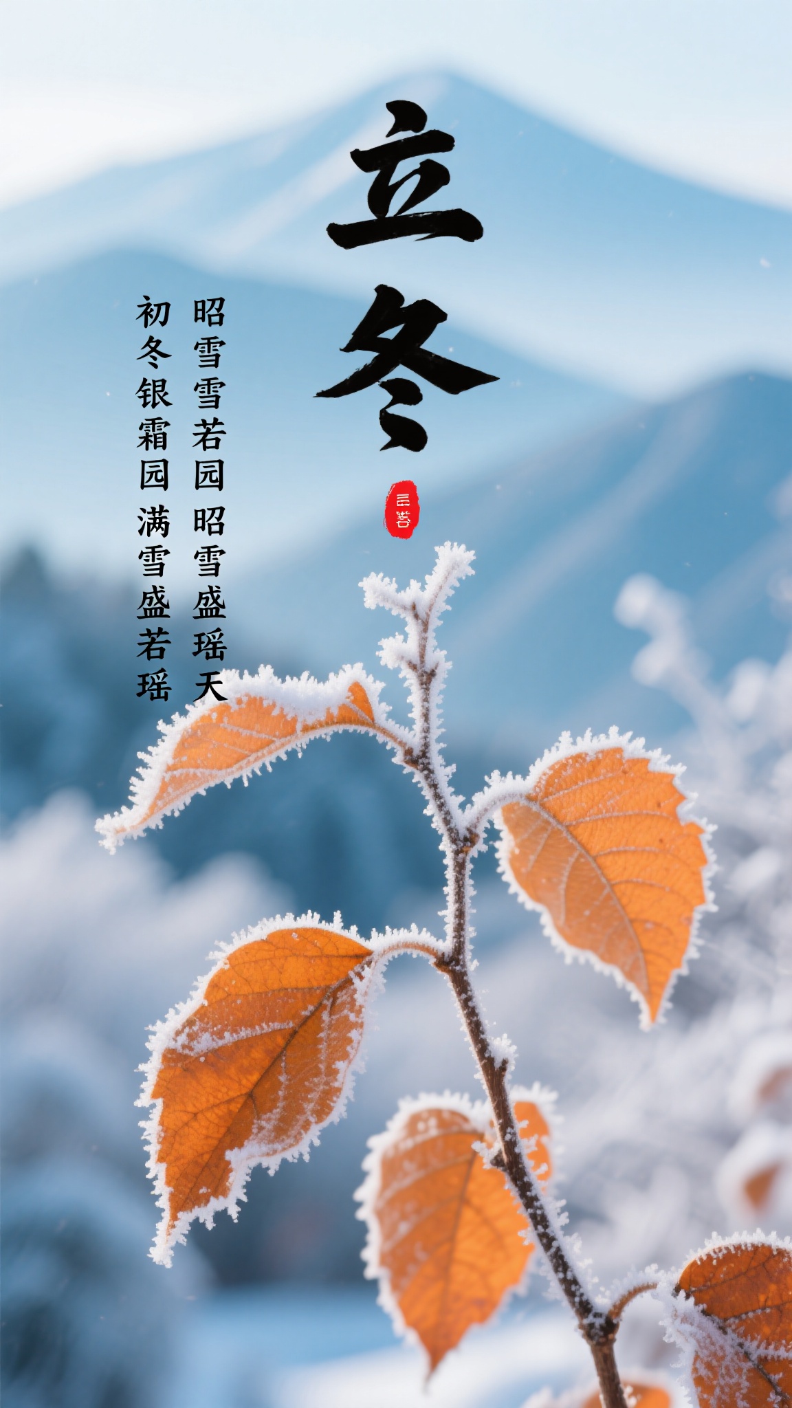 作品描述:微距诗意风格,立冬银霜枝叶,橙叶覆霜立细枝,背景淡蓝远山,“立冬” 黑红书法配文 “初冬银霜满园 昭雪盛若瑶天”,细节精致,诗意盎然。