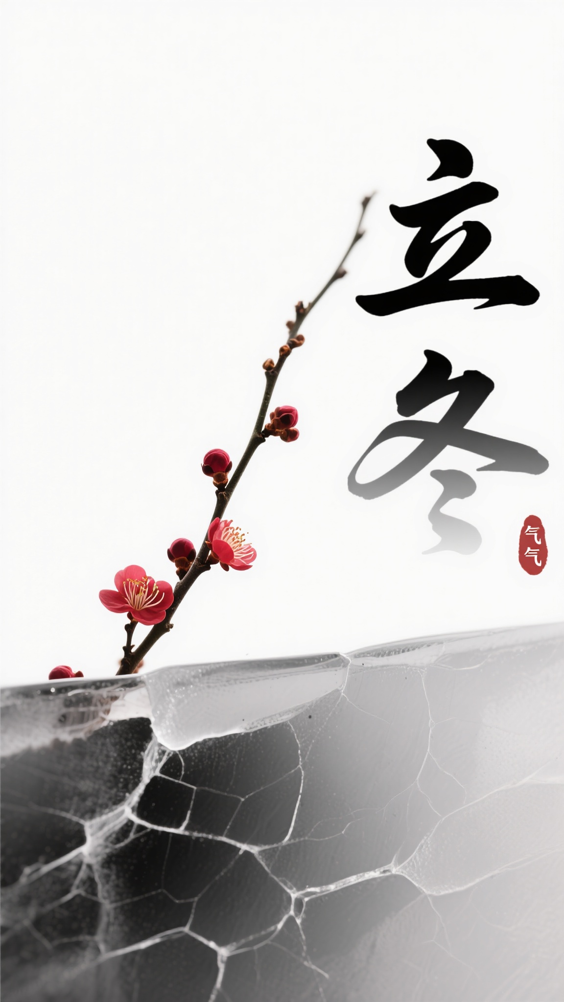 作品描述:极简留白风格,立冬节气,纯白背景 “立冬” 黑灰渐变书法,左侧干梅(数朵红梅),下方冰裂纹路,极简禅意。