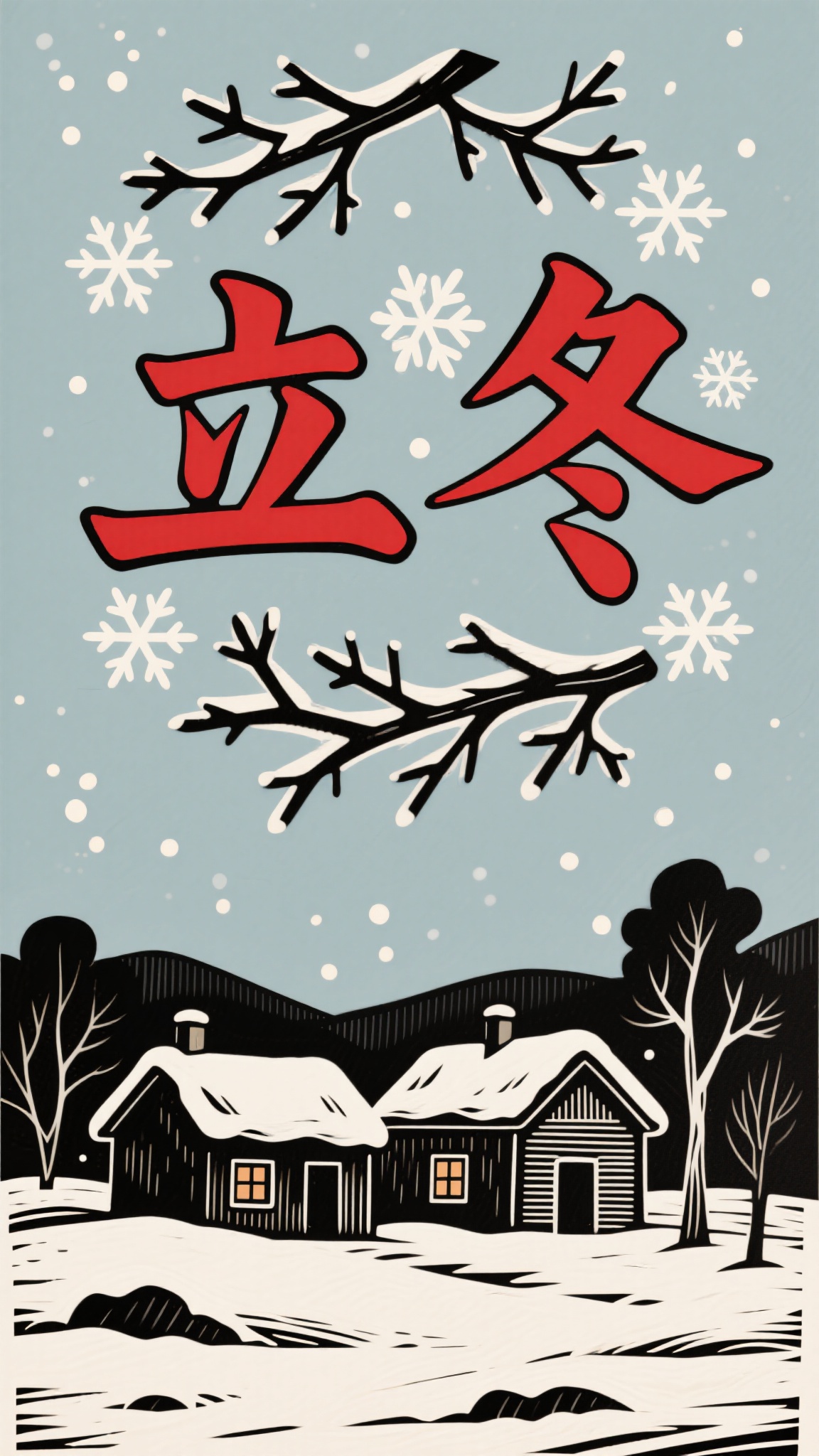 作品描述:复古版画风格,立冬主题,黑红配色 “立冬” 粗体版画字,装饰雪花、冻枝纹样,下方简笔雪地人家,复古浓烈。
