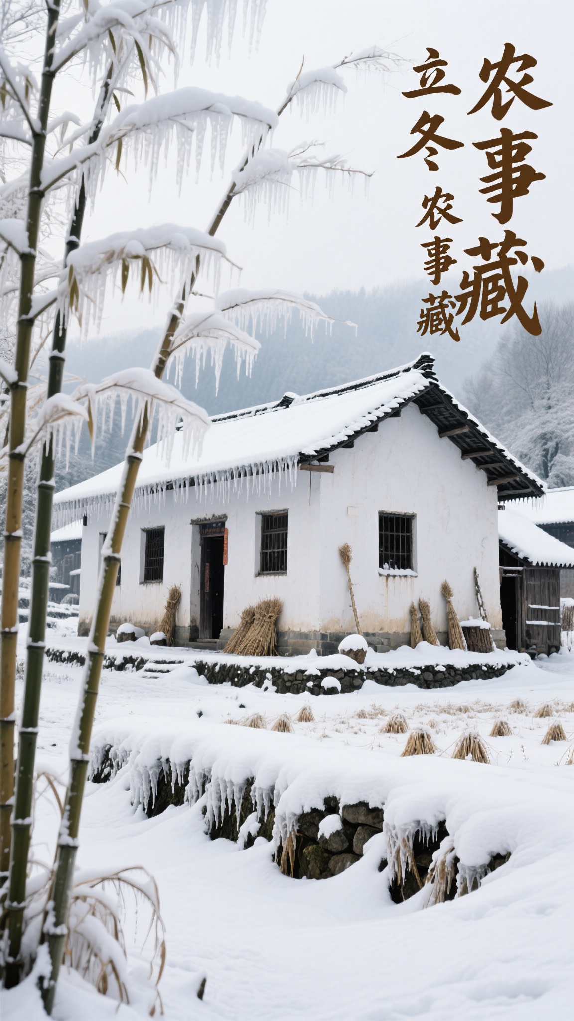 作品描述:田园静谧风格,立冬乡村雪景,白墙黑瓦农舍覆雪,院前竹枝挂冰,“立冬 农事藏” 手写棕字,恬淡宁静。