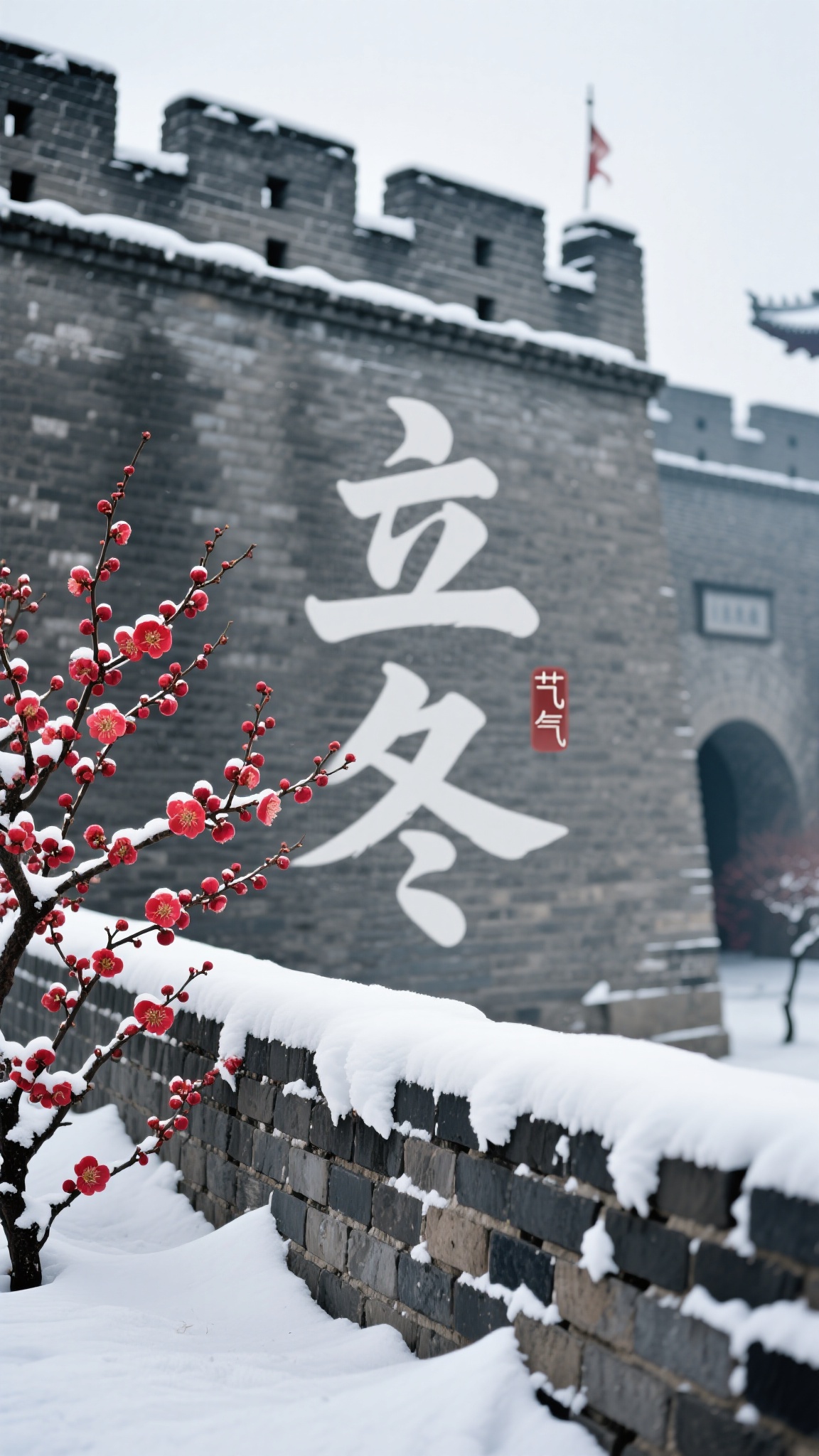 作品描述:建筑节气风格,立冬古城墙,积雪覆盖城砖,墙角红梅绽放,“立冬” 灰白大字,厚重展现历史建筑之美。