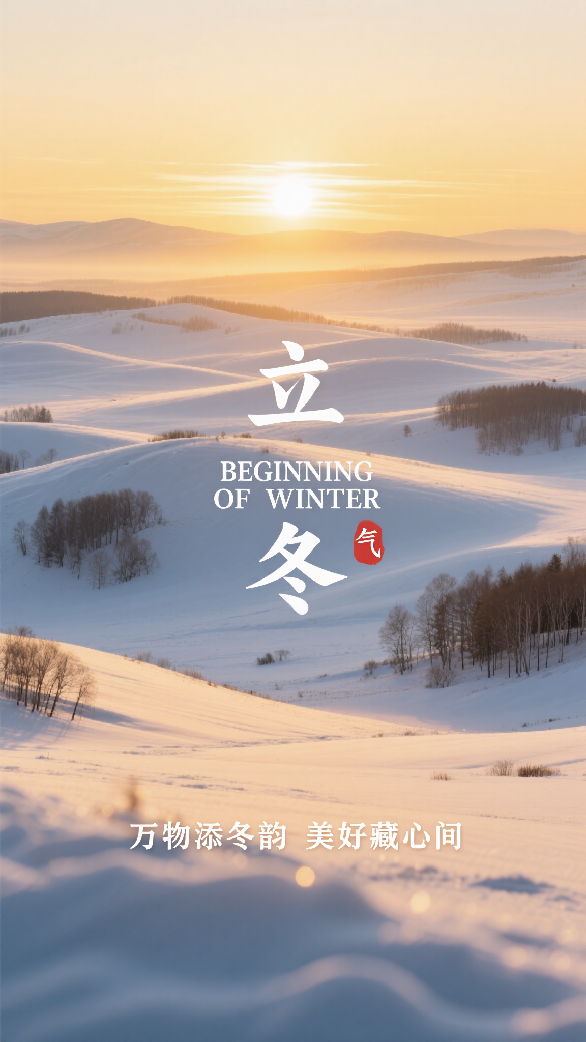 作品描述:平原雪原风格,立冬节气,金黄夕阳下的雪原丘陵辽阔无垠,疏林点缀其间,“BEGINNING OF WINTER” 英文与 “立冬” 汉字结合,配文 “万物添冬韵 美好藏心间”,写实风光风格,画面辽阔温暖。