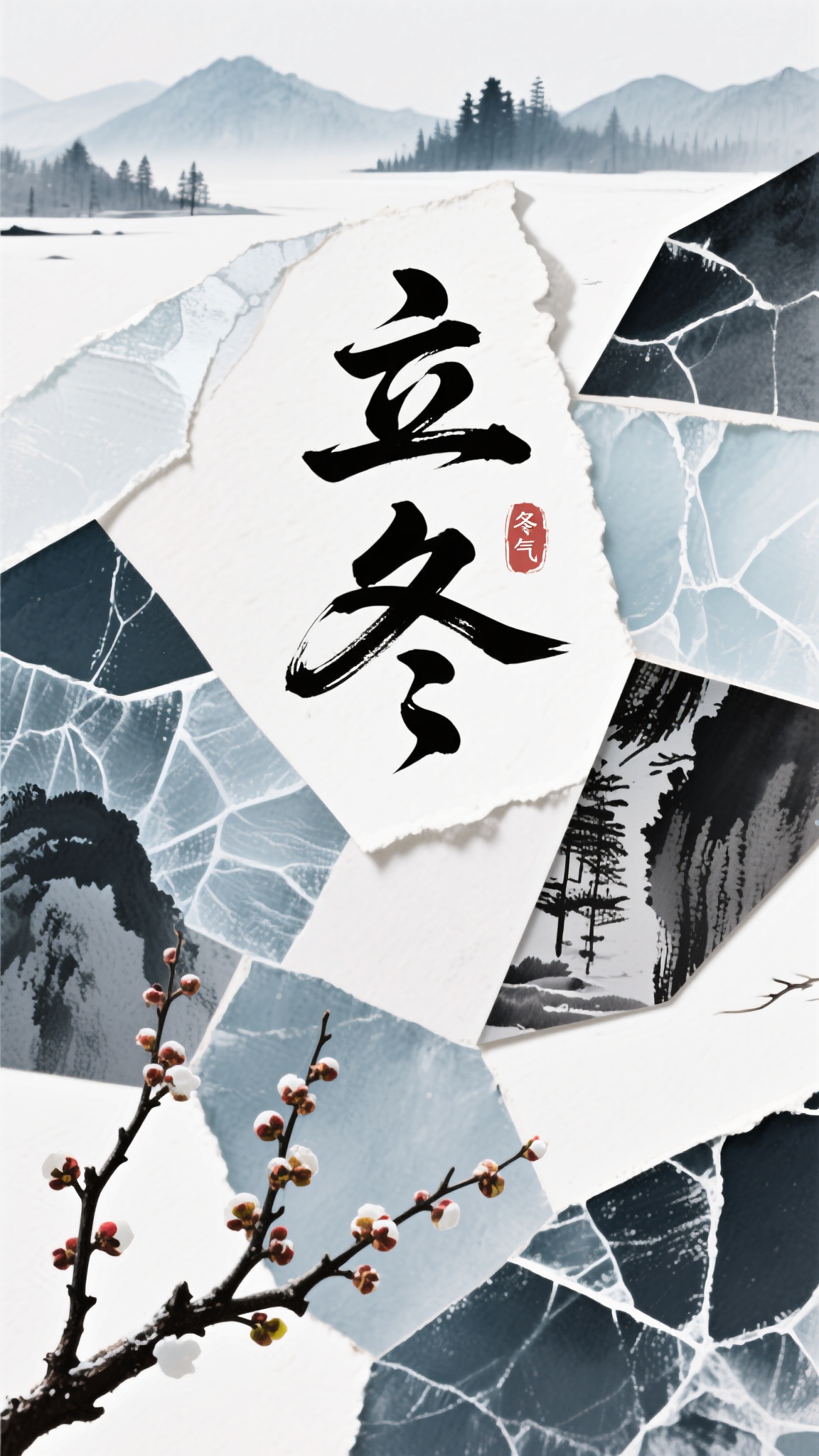 作品描述:水墨拼贴风格,立冬节气,水墨山水、梅枝、冰纹创意拼贴,“立冬” 书法居中,画面层次丰富,水墨拼贴技法独特,艺术感强烈。