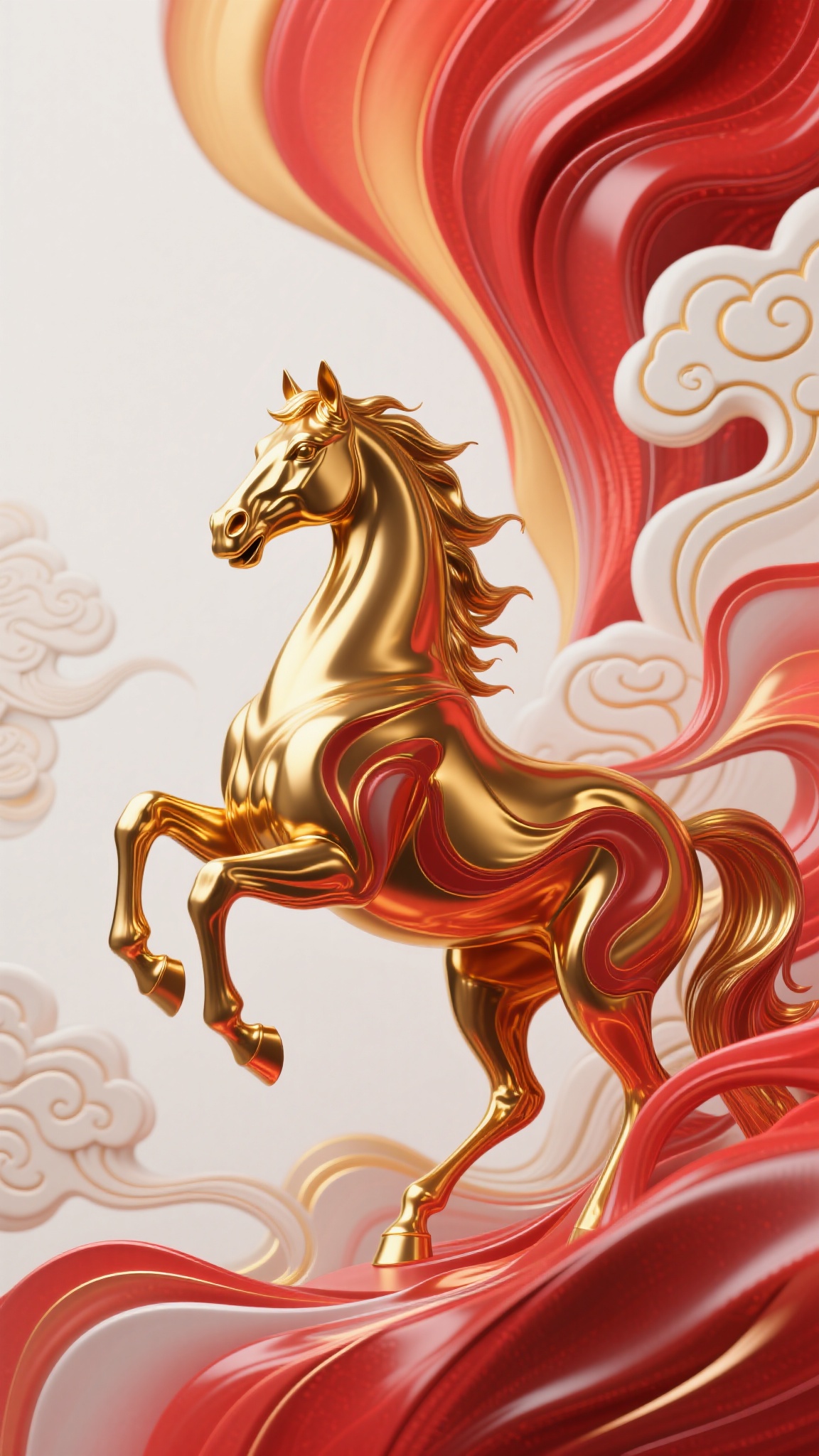 作品描述:流体艺术风格,金马呈红金流体渐变,背景流体祥云,色彩流动,艺术感独特。