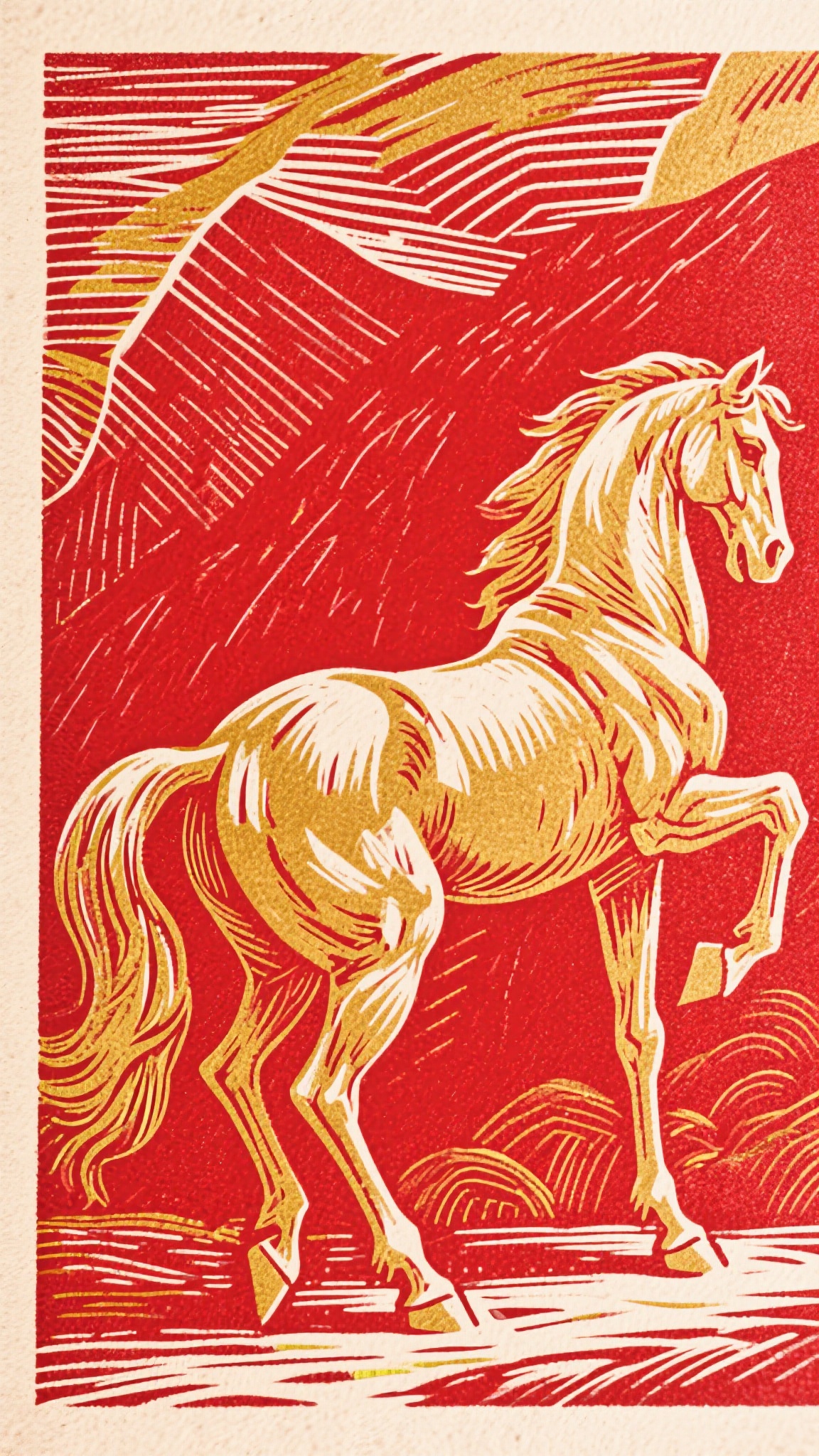 作品描述:复古版画风格,金马复古版画技法,线条粗犷,红色版画纹理背景,风格复古浓烈。