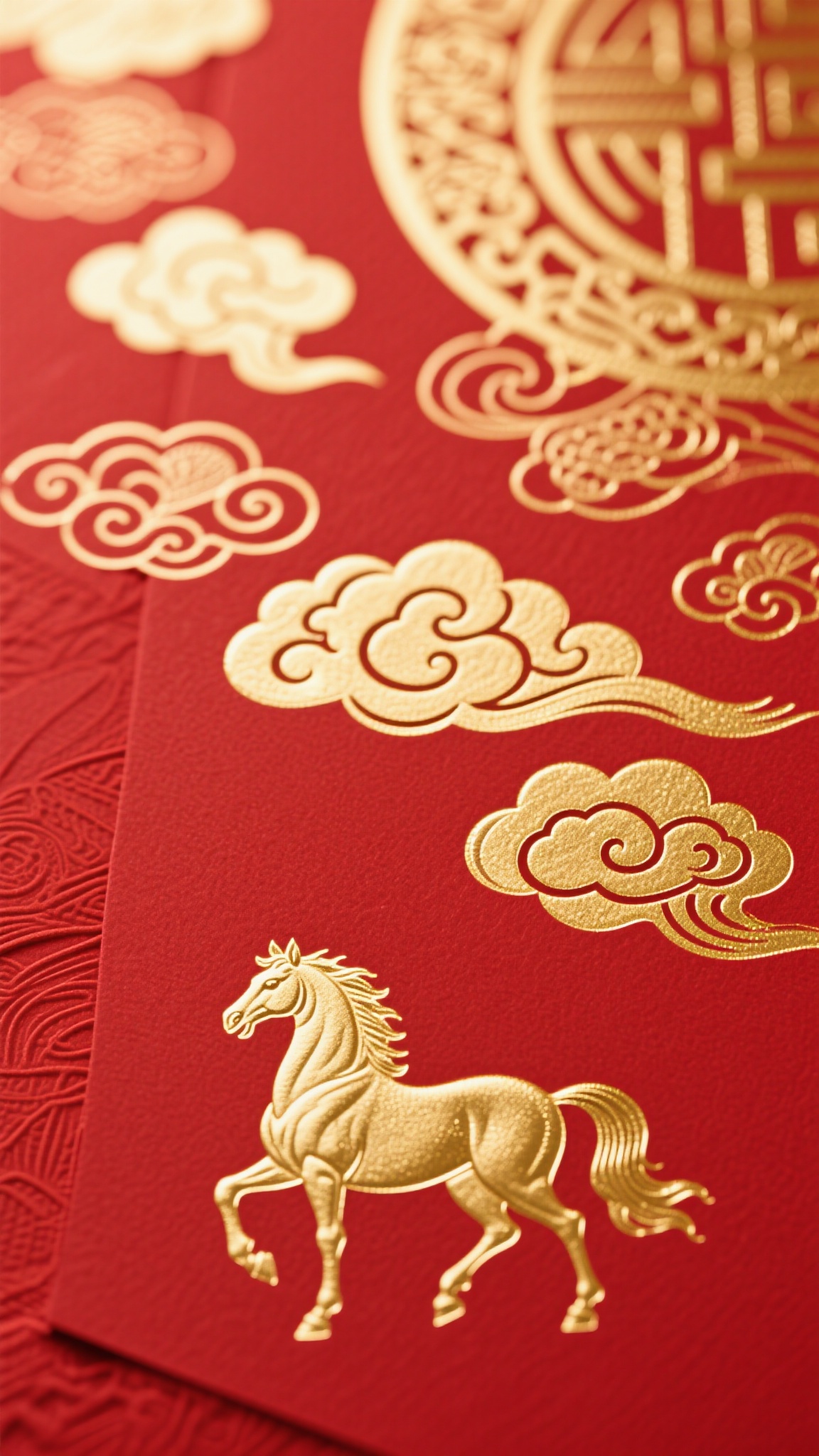 作品描述:烫金风格,金马烫金工艺(画面底部),红色纸张背景,烫金祥云、传统花纹,工艺感十足。