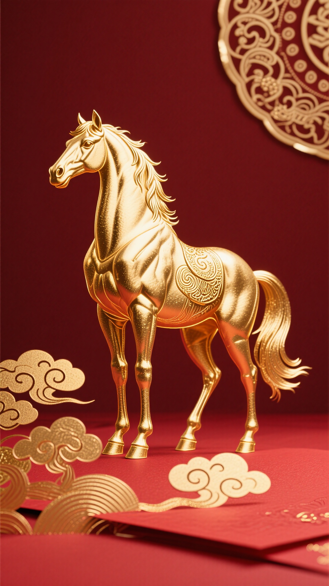 作品描述:烫金风格,金马烫金工艺(高头大马,画面底部),红色纸张背景,烫金祥云、传统花纹,工艺感十足。