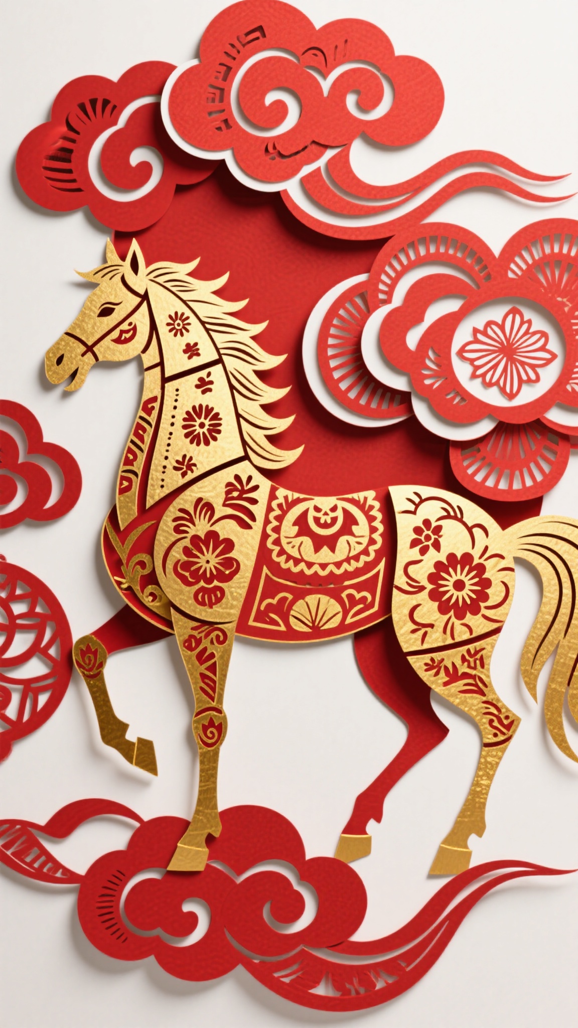 作品描述:拼贴风格,金马由剪纸、年画纹样拼贴而成,红色拼贴祥云背景,艺术感创新。