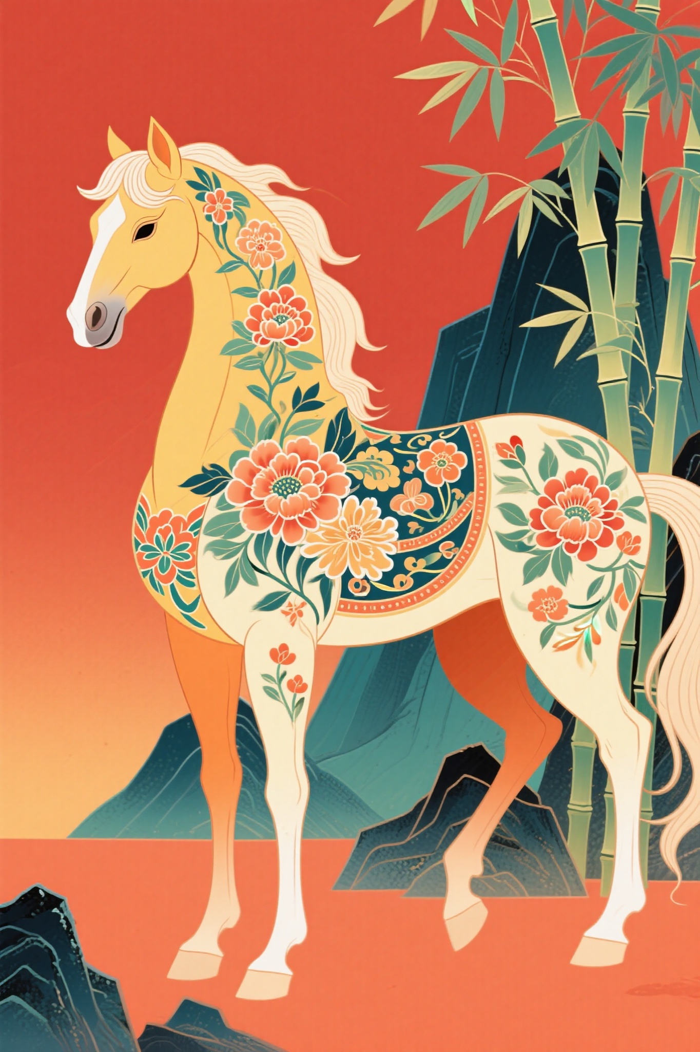 作品描述:国潮插画风格,马身饰传统花卉纹样,搭配竹子、山石,色彩红橙黄渐变,国风质感,细节精致。