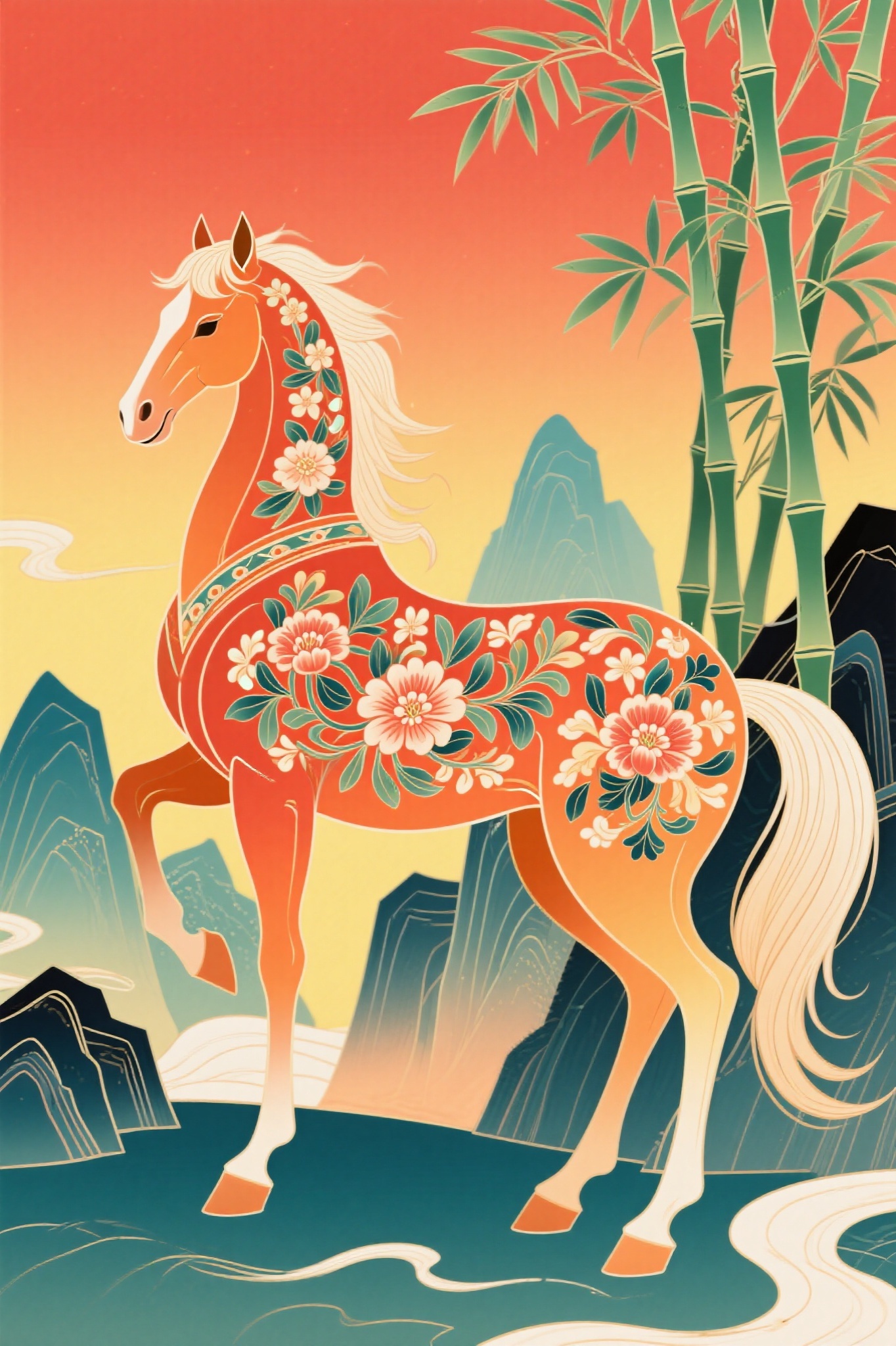 作品描述:国潮插画风格,马身饰传统花卉纹样,搭配竹子、山石,色彩红橙黄渐变,国风质感,细节精致。
