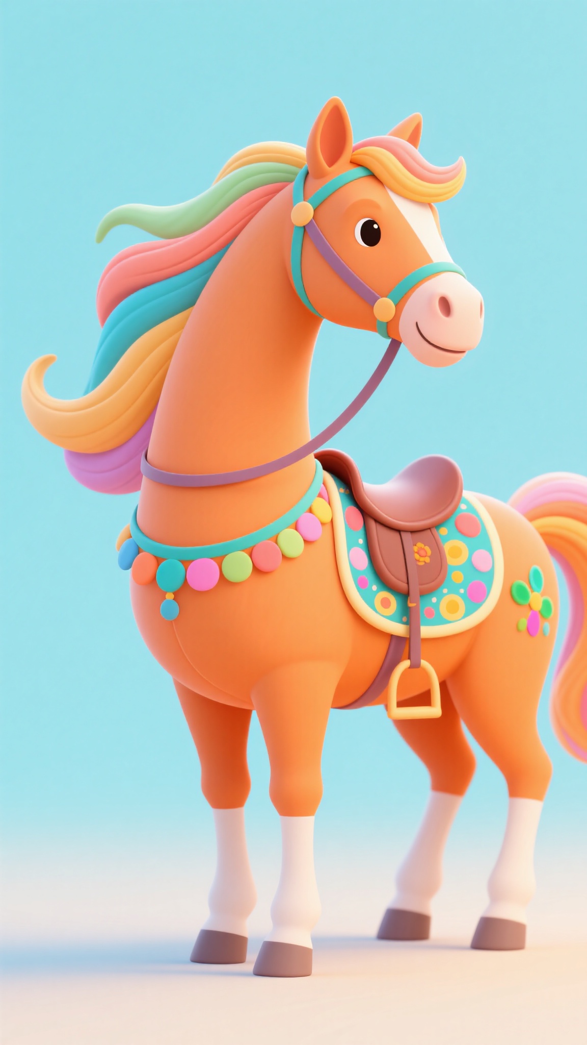 作品描述:卡通治愈风格,暖橙色马身,饰彩色花纹鞍具,鬃毛飘逸,色彩柔和,童趣满满。