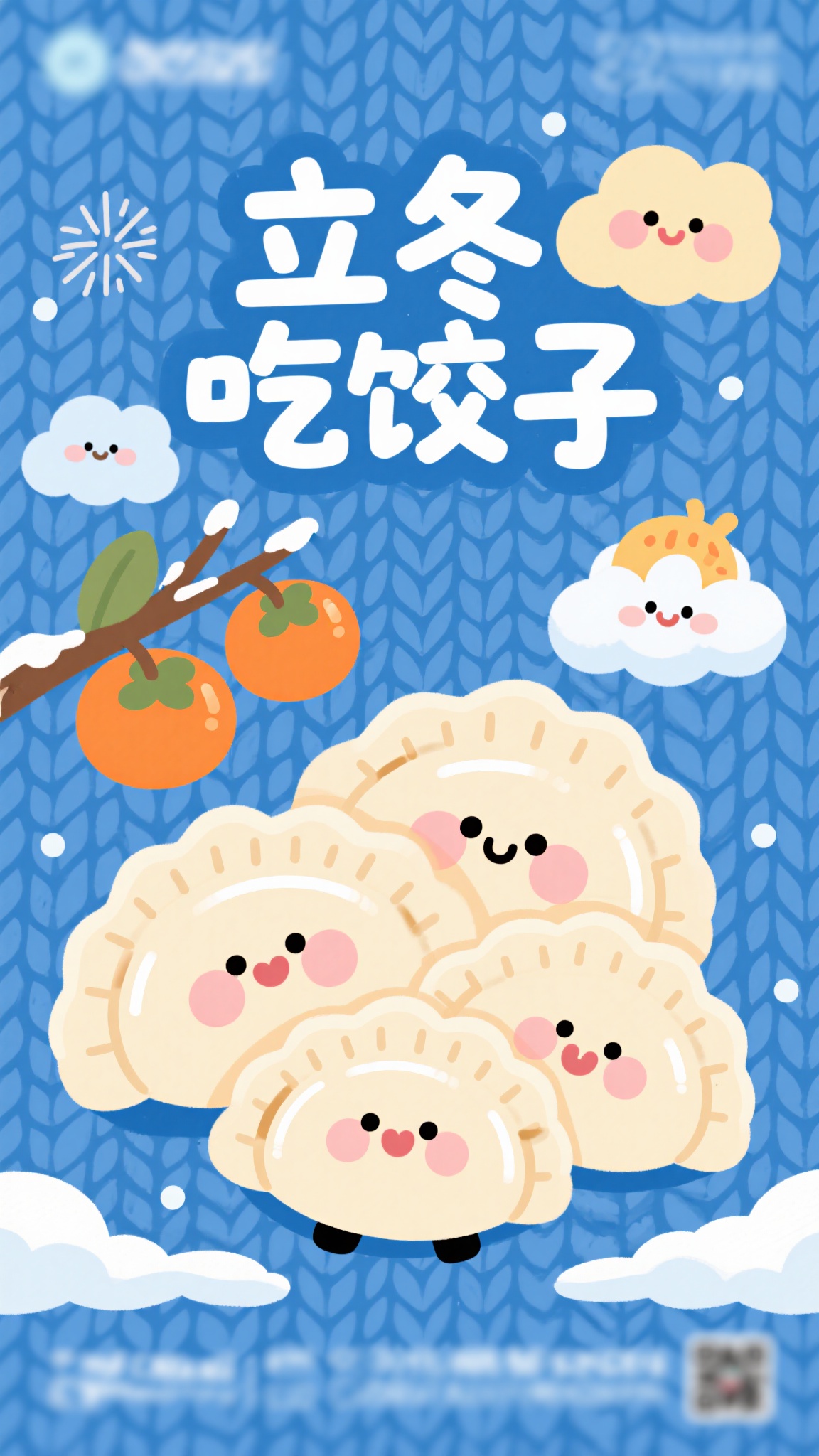 作品描述:卡通治愈风格,立冬饺子海报,萌系饺子搭配橙柿枝、卡通云朵,背景针织纹理蓝白雪景,童趣满满,凸显 “立冬吃饺子” 的民俗。