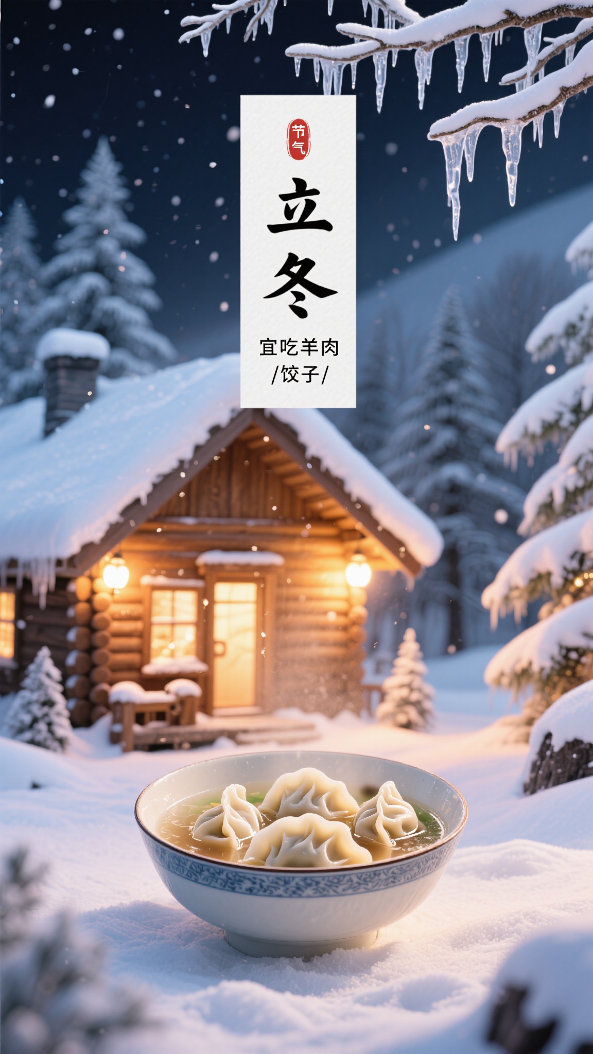 作品描述:温馨雪景风格,立冬饺子海报,一碗汤饺置于亮着暖灯的雪景木屋前,背景雪松覆雪、冰棱树枝,上方节气卡片 “立冬 宜吃羊肉 / 饺子”,营造冬日小屋吃饺的治愈氛围。