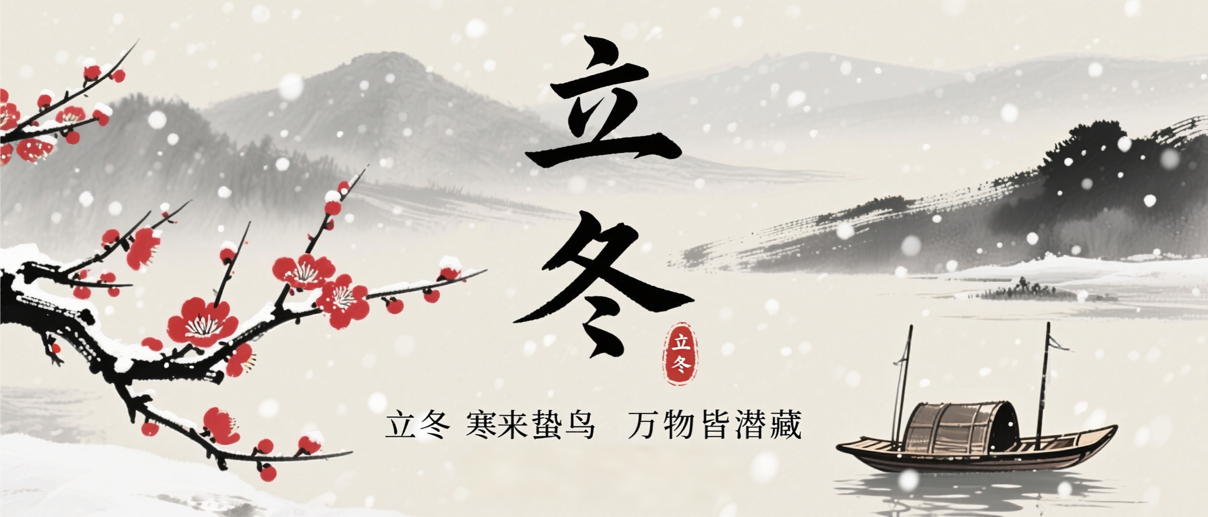 作品描述:水墨国风风格,立冬公众号封面,红梅枝、水墨山水、孤舟元素,雪花飘落,“立冬 寒来蛰鸟归 万物皆潜藏” 文字,尽显中式雅致