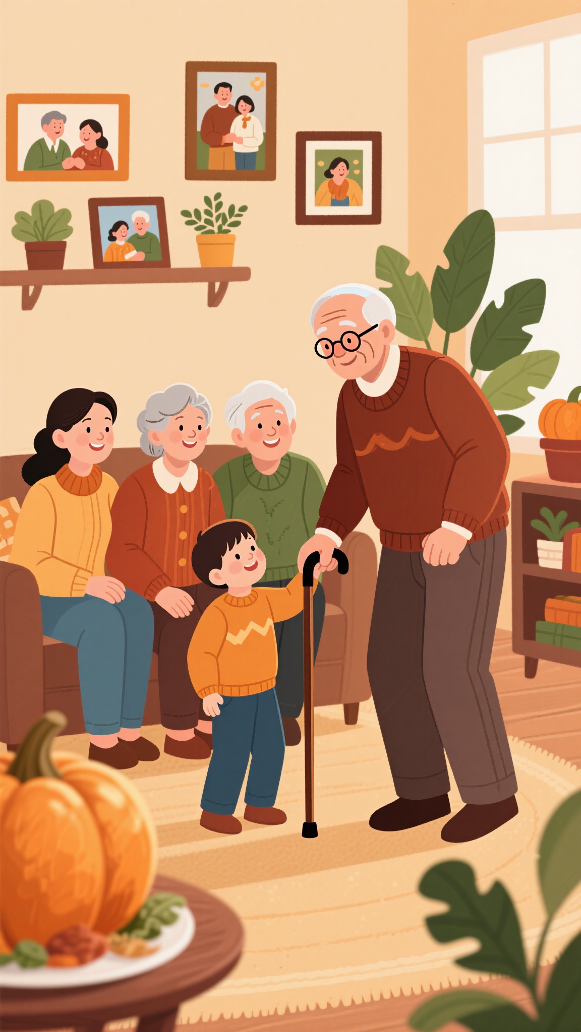 作品描述:多代同堂风格,感恩节背景,祖孙三代温馨互动(老人拄拐杖,晚辈搀扶陪伴),居家背景含家庭照片、绿植,暖色调插画