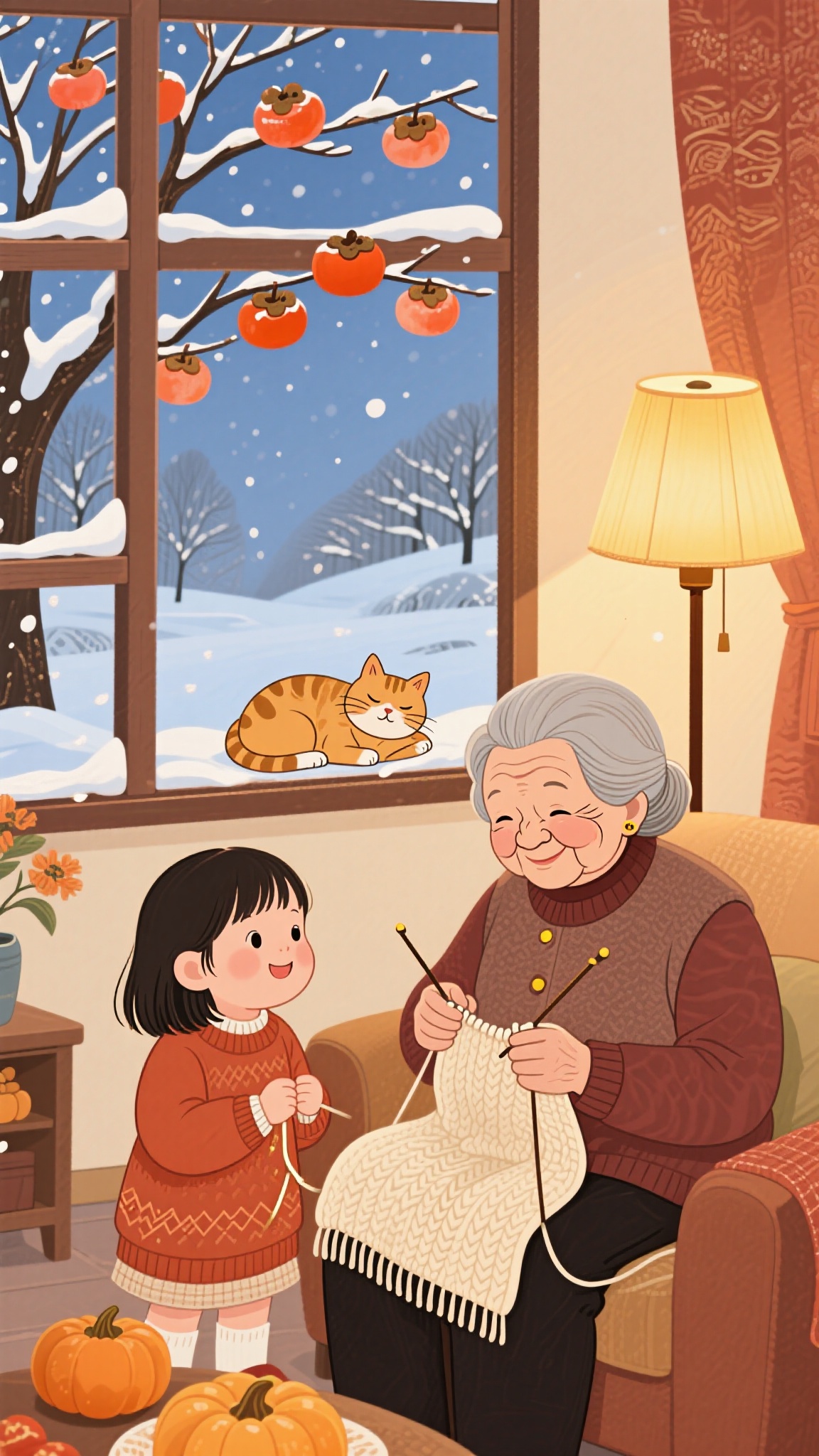 作品描述:国风温馨风格,感恩节插画背景,祖孙居家场景(老奶奶织毛衣,小女孩围观),窗边雪景柿枝、酣睡猫咪、暖黄落地灯