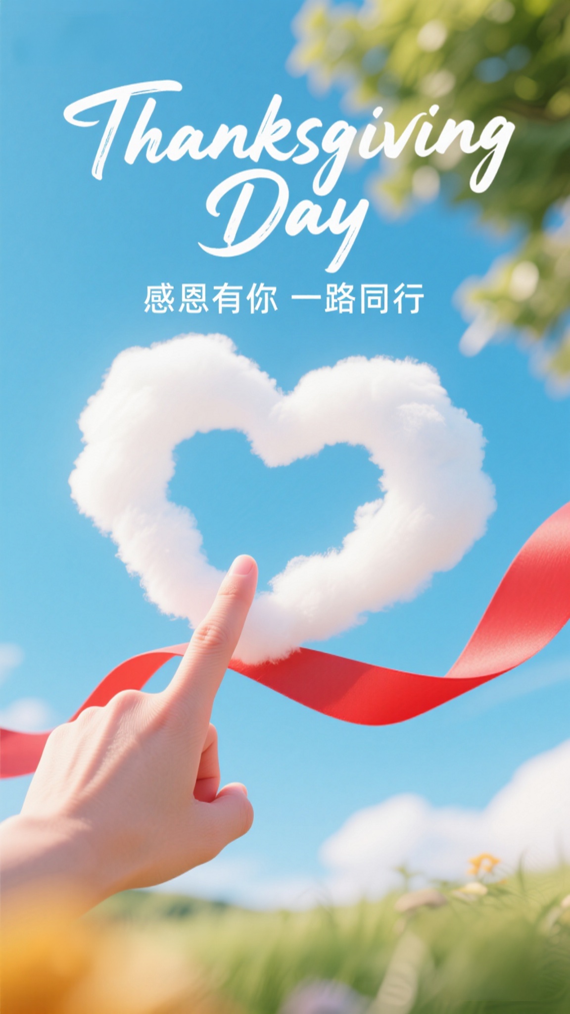 作品描述:清新自然风格,感恩节海报,蓝天心形云朵,手指牵引红丝带,“Thanksgiving Day” 手写英文 +“感恩有你 一路同行” 中文