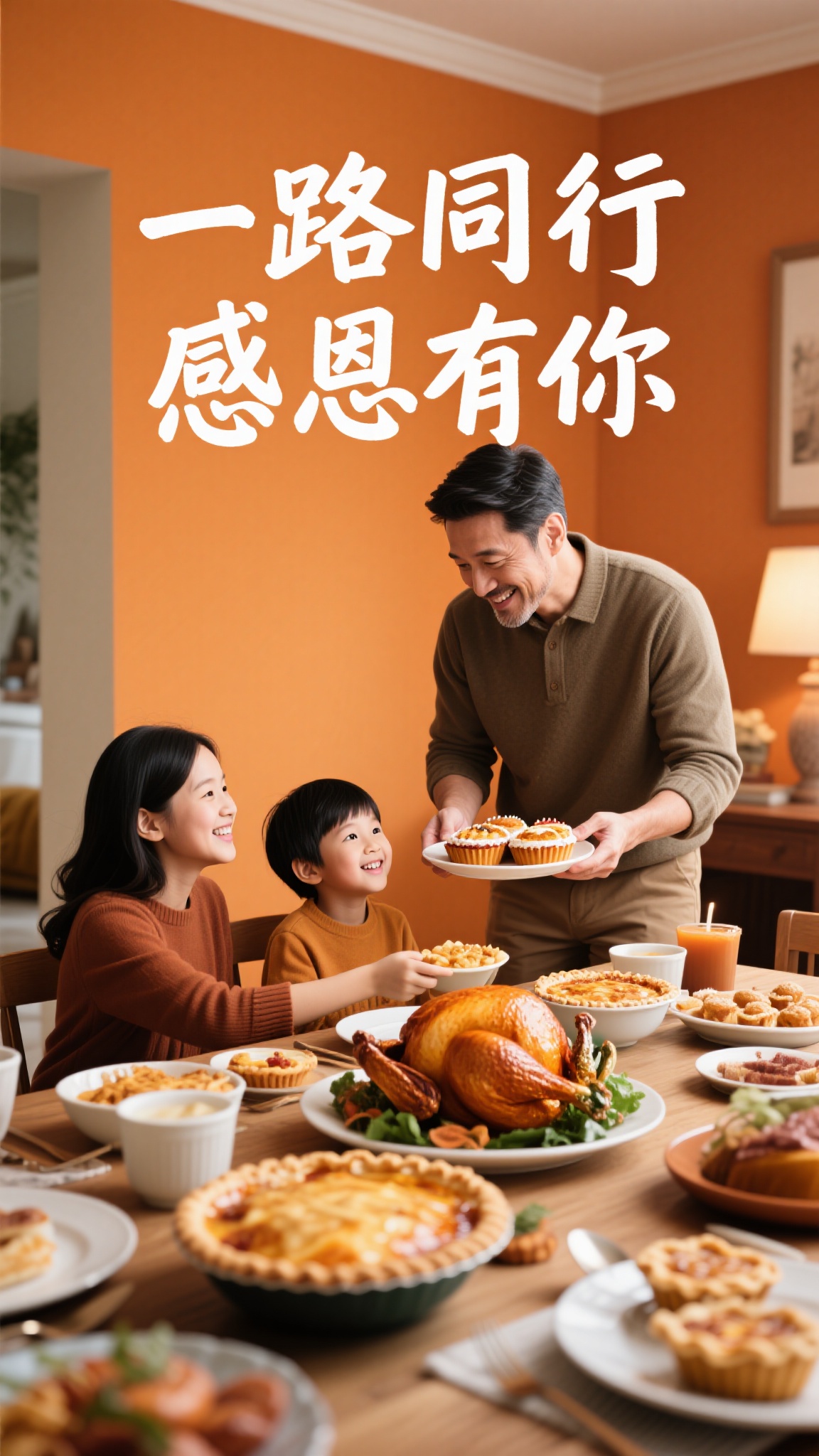 作品描述:家庭聚餐风格,感恩节海报,一家三口(父亲端点心)围坐餐桌,火鸡、派摆满桌,暖橙居家背景,“一路同行 感恩有你” 手写体