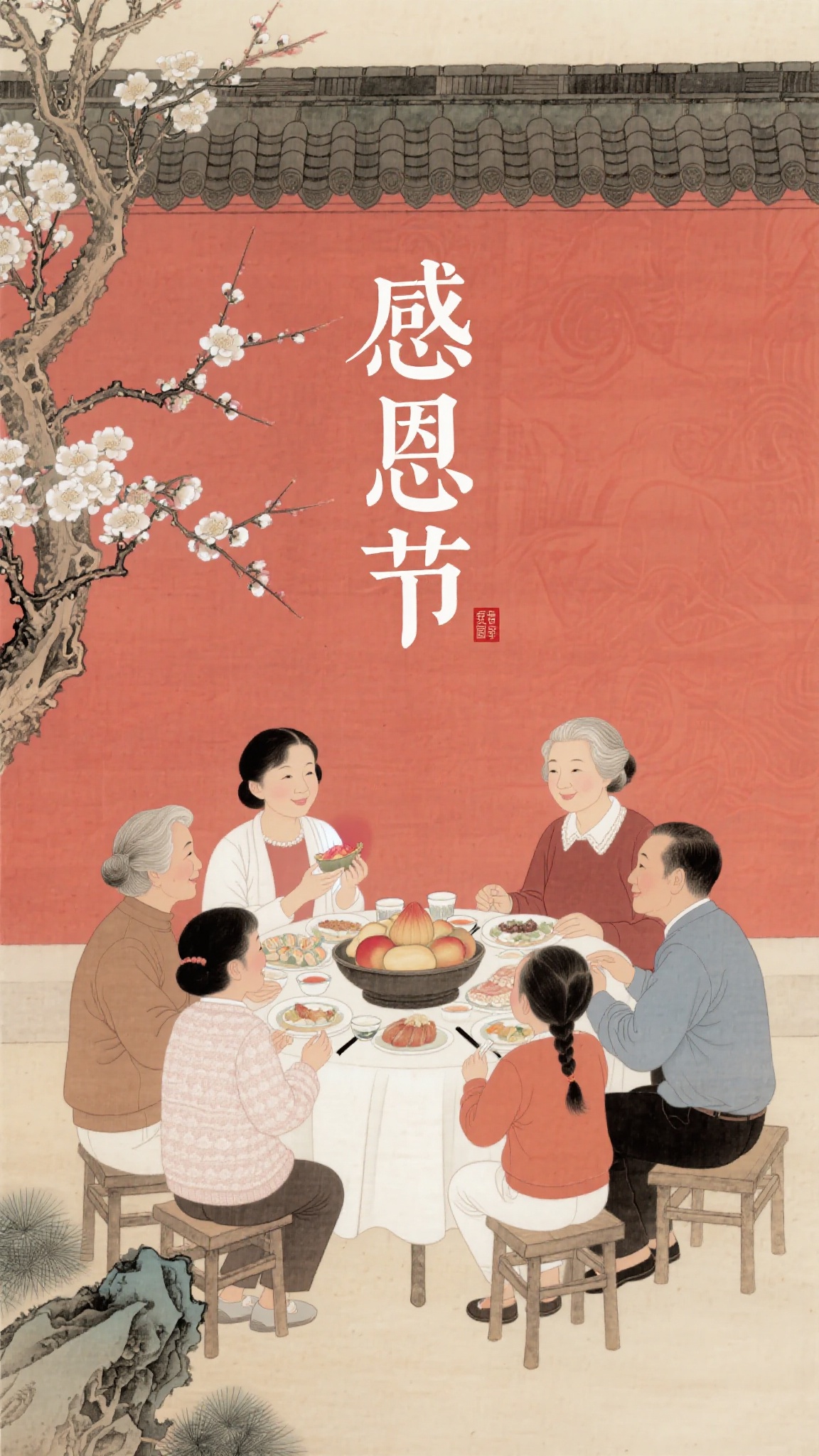 作品描述:国风工笔风格,感恩节海报,工笔绘制的家庭感恩宴场景(家人围坐),背景红墙黛瓦、梅花枝,工笔细腻雅致