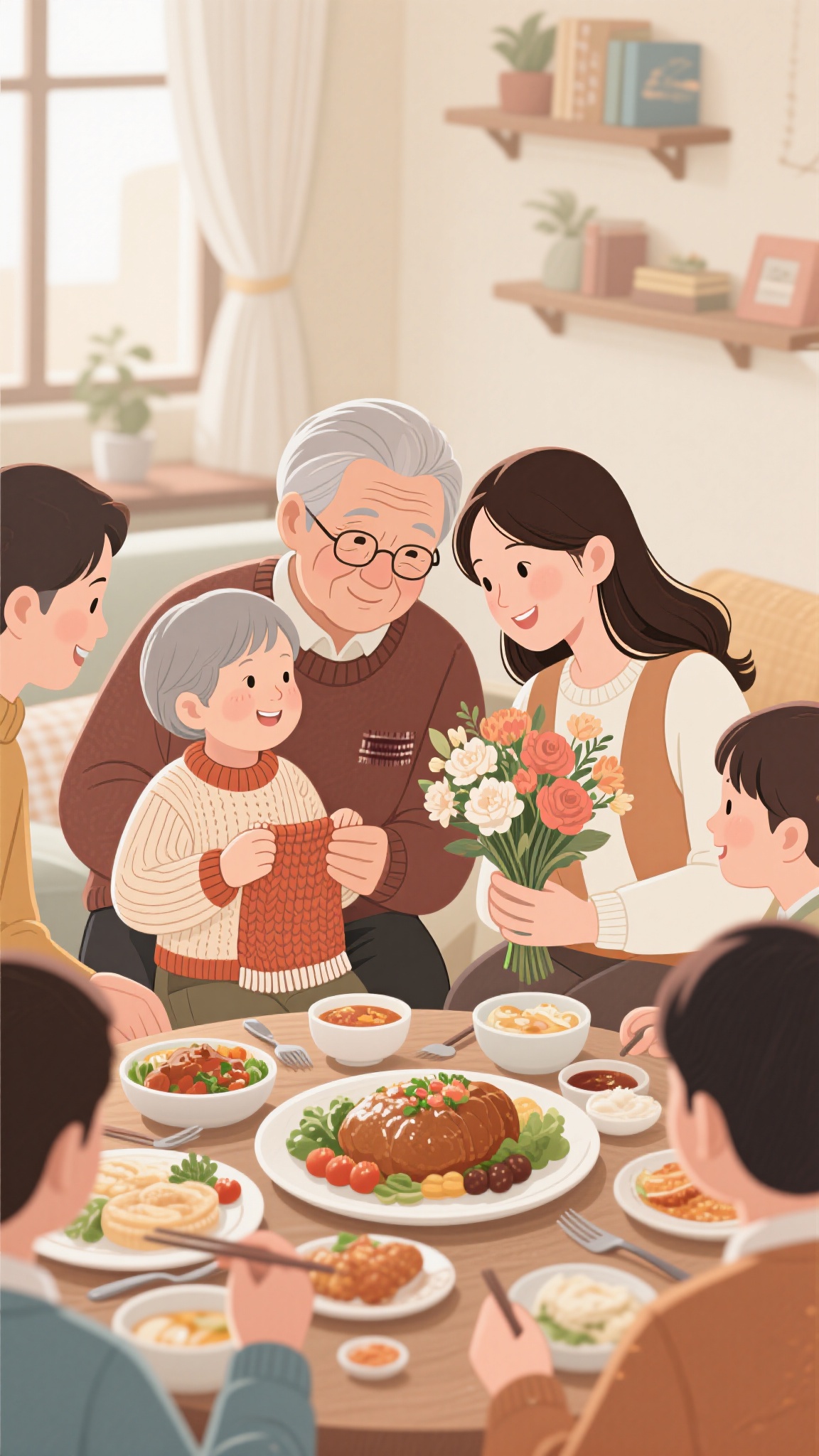 作品描述:以家庭、亲情互动为核心,色彩柔和细腻,充满故事感。 元素参考:祖孙织毛衣的居家场景、母女赠花的温馨画面、全家围坐享感恩大餐的团圆感插画。 适用场景:母婴、家居、生活服务类品牌,传递 “感恩亲情” 的情感价值。 二、写实美食风格