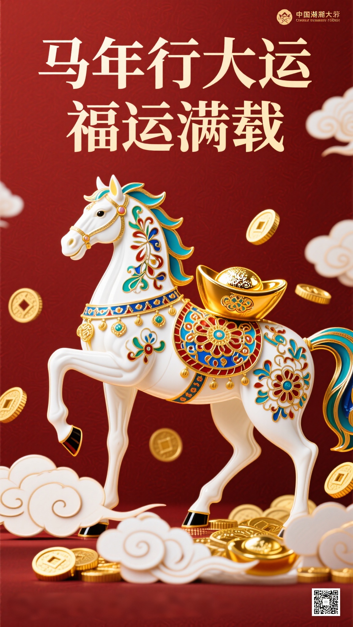 作品描述:国潮珐琅彩风格,马年海报,白色珐琅彩马(饰繁花纹样)驮金元宝,祥云、金币点缀,“马年行大运 福运满载” 文字,深红背景