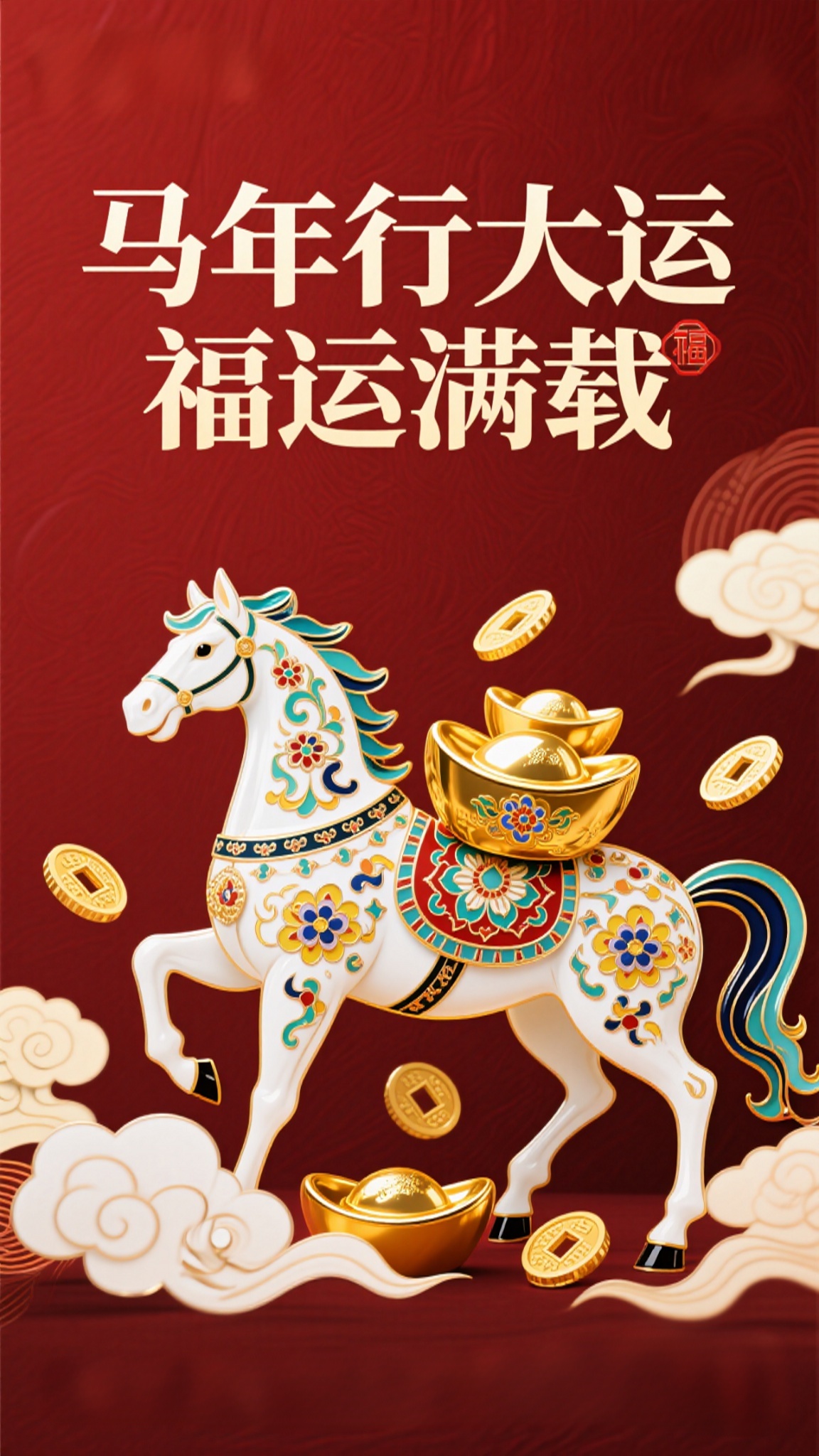 作品描述:国潮珐琅彩风格,马年海报,白色珐琅彩马(饰繁花纹样)驮金元宝,祥云、金币点缀,“马年行大运 福运满载” 文字,深红背景