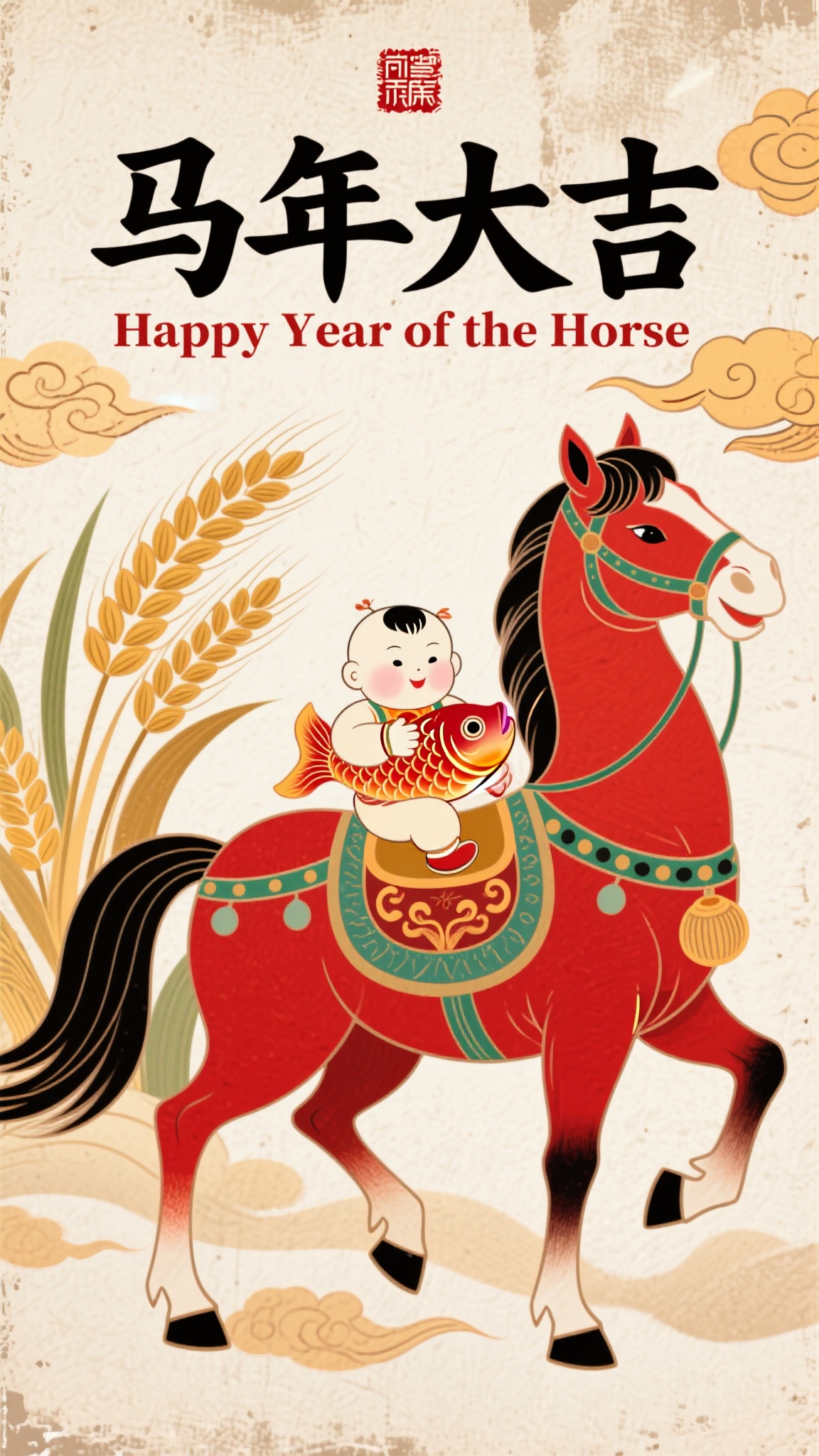 作品描述:传统年画风格,马年海报,红马驮抱鱼娃娃,麦穗、祥云装饰,复古做旧纹理,“马年大吉 Happy Year of the Horse” 文字