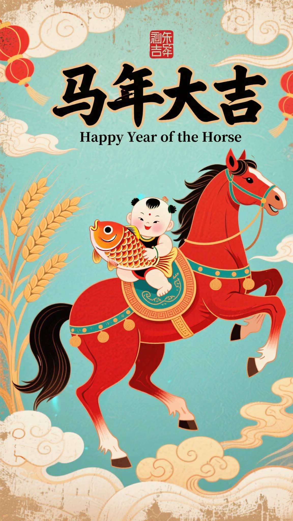 作品描述:传统年画风格,马年海报,红马驮抱鱼娃娃,麦穗、祥云装饰,复古做旧纹理,“马年大吉 Happy Year of the Horse” 文字