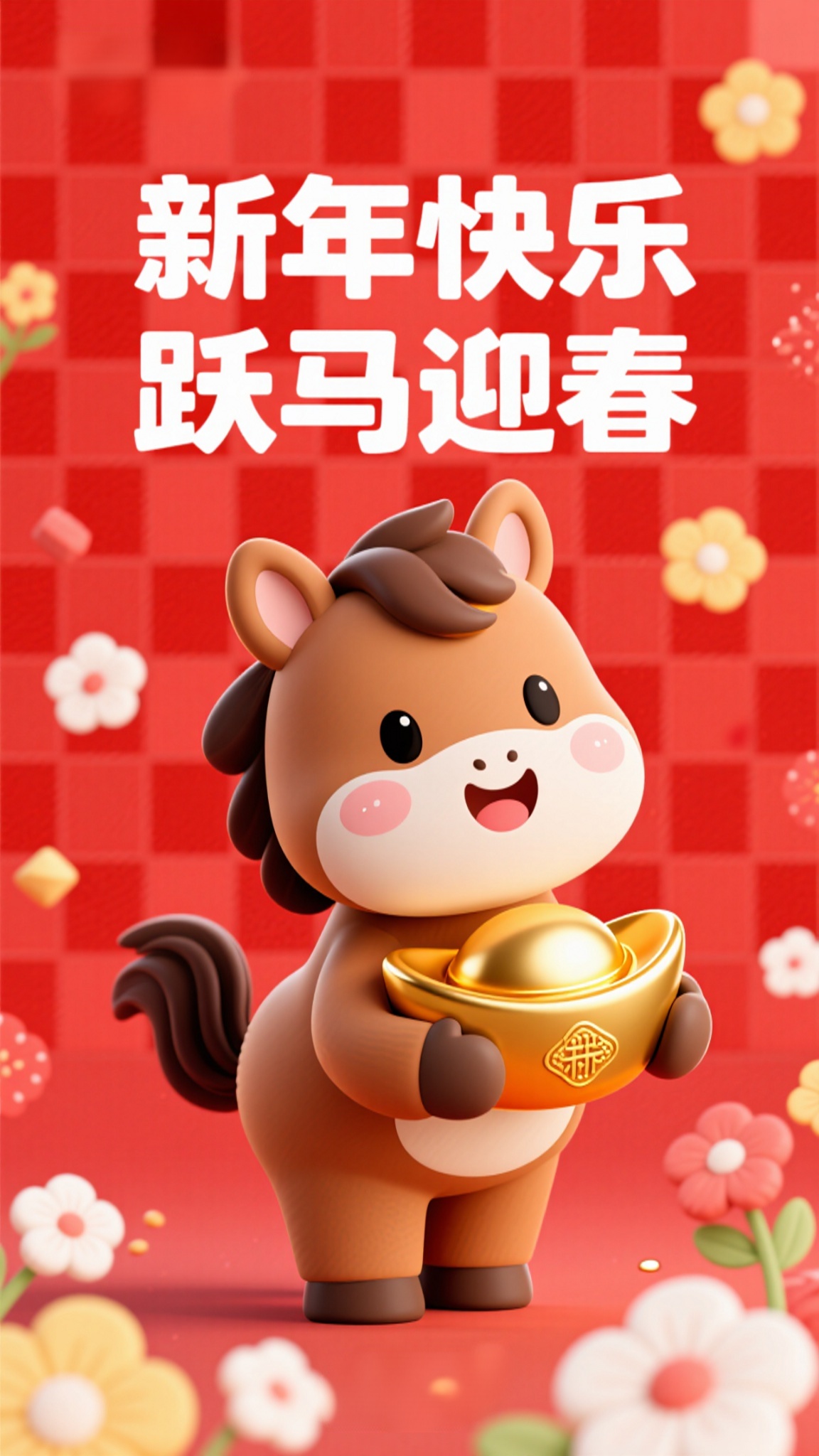 作品描述:萌系卡通风格,马年海报,棕马萌宠抱金元宝,花朵点缀,红格背景,“新年快乐 跃马迎春” 文字