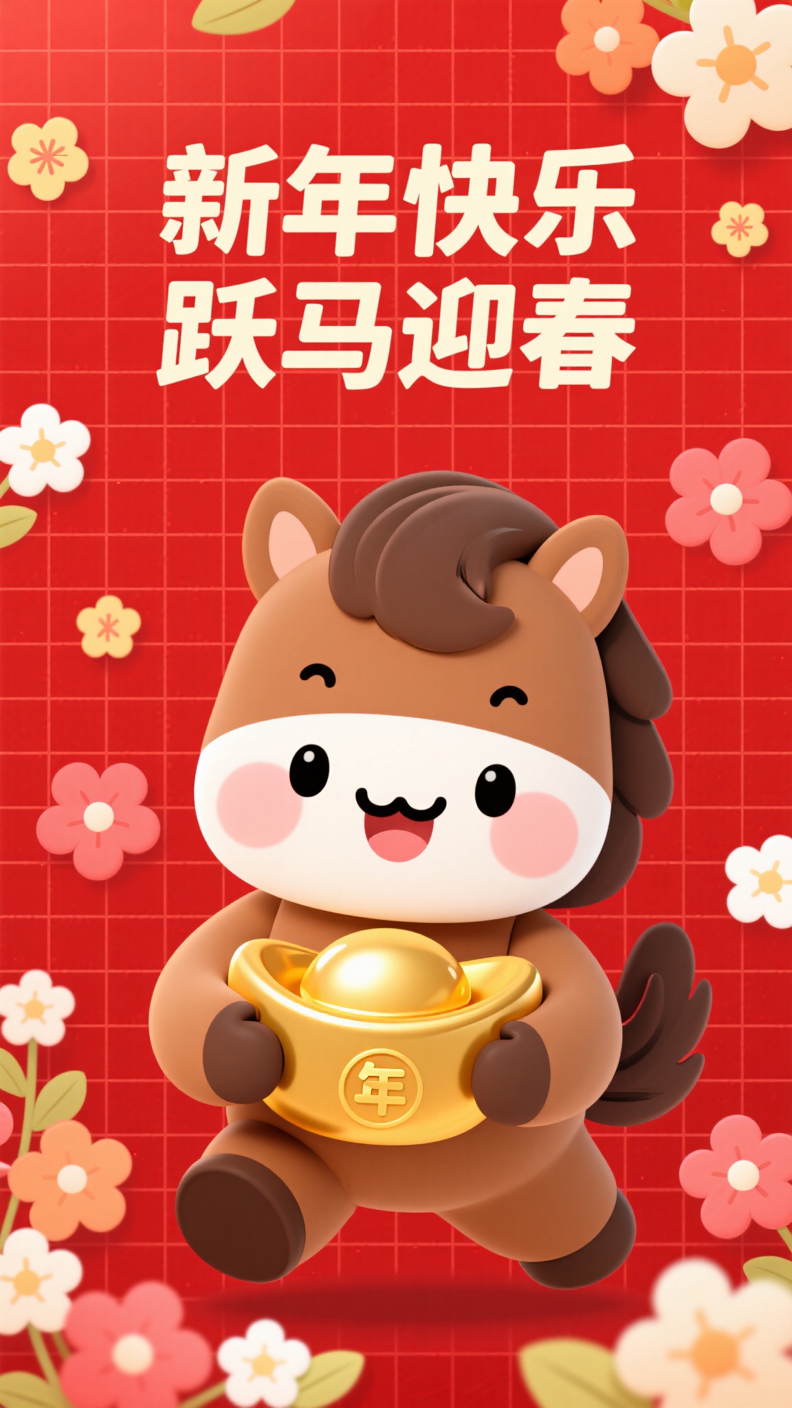 作品描述:萌系卡通风格,马年海报,棕马萌宠抱金元宝,花朵点缀,红格背景,“新年快乐 跃马迎春” 文字