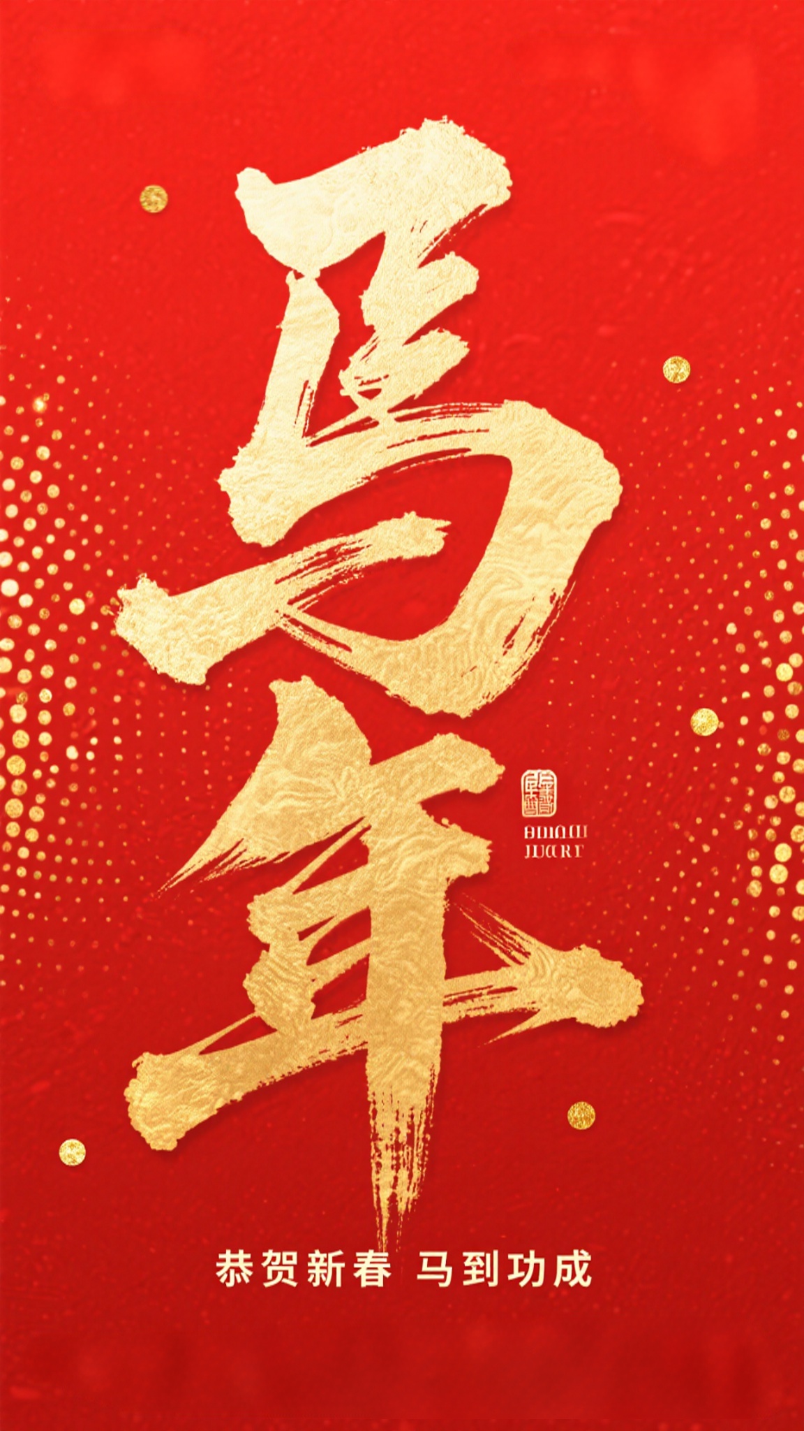 作品描述:书法大气风格,马年海报,红色背景,金色 “马” 字书法,环绕 “恭贺新春 马到功成” 吉祥语,金点装饰