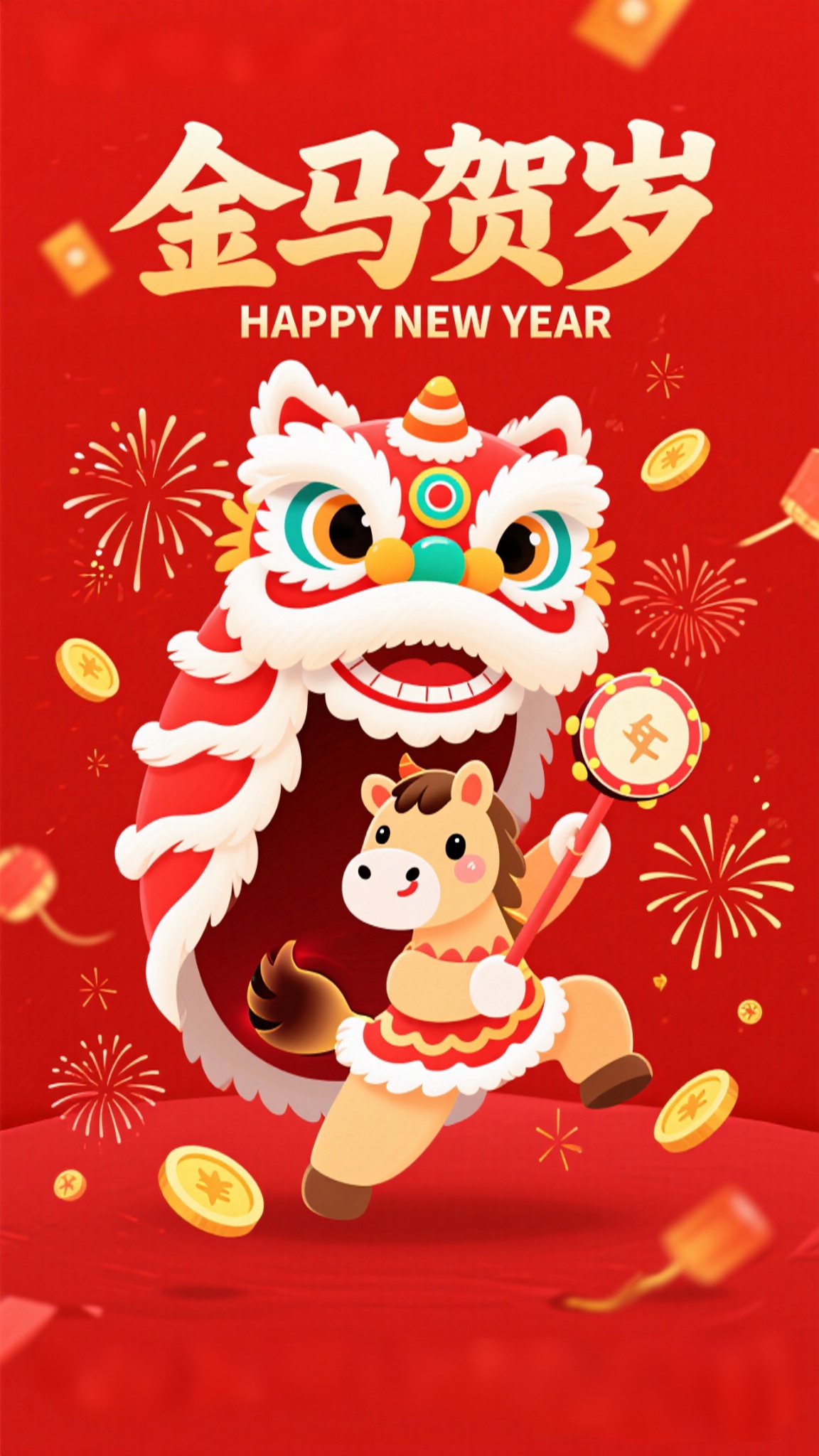 作品描述:舞狮贺岁风格,马年海报,红狮舞头,卡通小马持拨浪鼓,金币、烟花环绕,“金马贺岁 HAPPY NEW YEAR” 文字,红背景